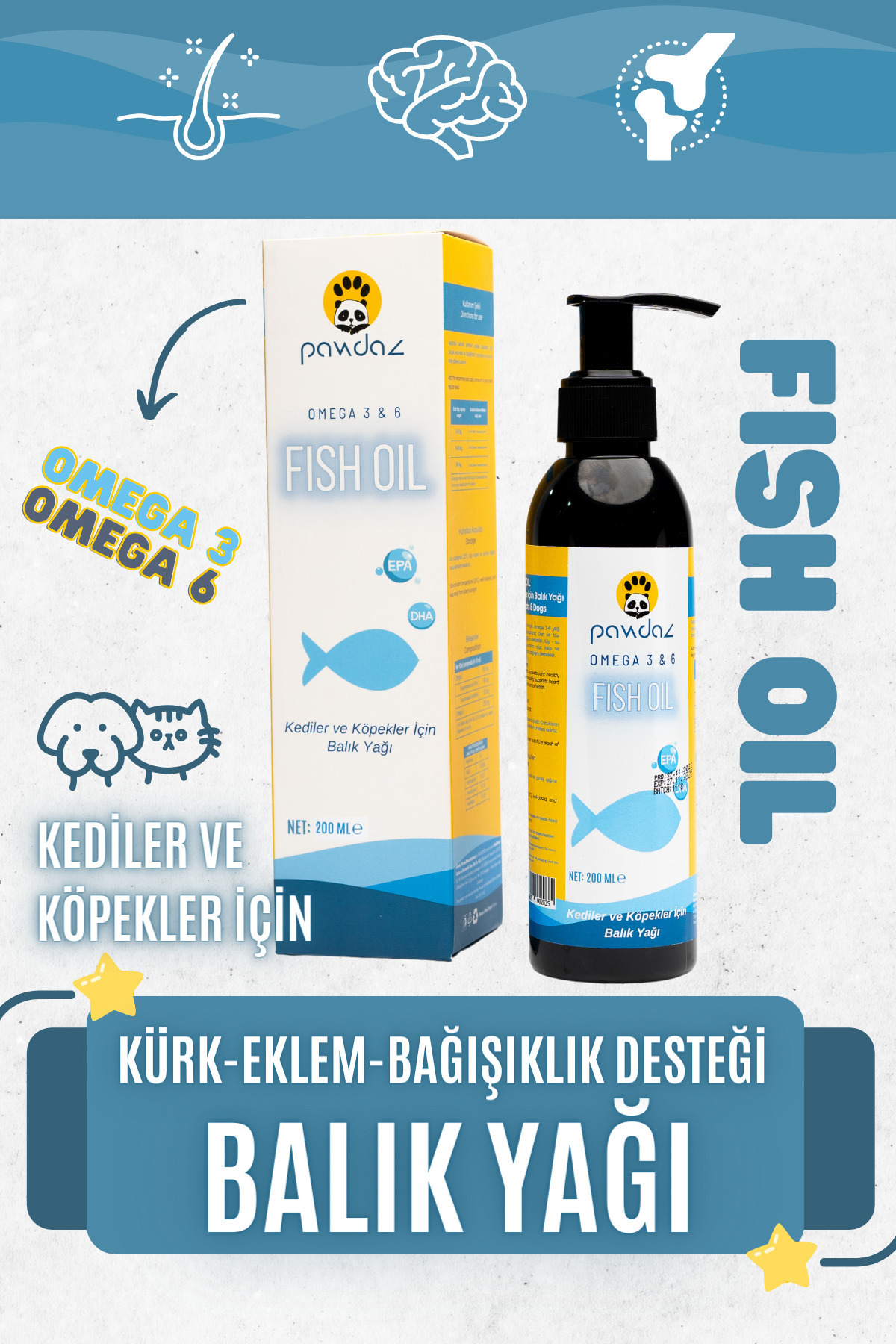 KÜRKÜM SERISI pawdaz Fish Oil içerdigi EPA VE DHA ile köpeginizin kedinizin deri ve tüy sagligini destekler, eklem sagligini destekler, kalp ve dolasim sagligini destekler. Mental sagligi destekler. Kedinizin ve köpeginizin kürkünü saglikli ve parlak tutun! pawdaz Fish Oil, kedilerin ve köpeklerin deri-tüy sagligini desteklemek için özel olarak formüle edilmis bir üründür ve agir balik yagi kokulari uzaklastirilmistir. Omega 3-6 yag asitleri bakimindan zengindir. Omega yag asitleri, cildin ve tüylerin saglikli kalmasina yardimci olan temel yag asitleridir. Lezzetlidir. Pawdaz Fish Oil, kediler ve köpekler tarafindan kolayca tüketilebilen lezzetli bir sividir. Mamasina ilave ederek rahatça kullanabilirsiniz. Deri ve tüylerin saglikli kalmasina yardimci olabilir. Kasinti ve dökülmeyi azaltmaya yardimci olabilir. Keratin üretimini artirmaya yardimci olabilir. Kil köklerini güçlendirmeye yardimci olabilir. Pawdaz Fish Oil, tüm irklar ve yaslardaki kediler köpekler için uygundur. Net : 200 ml. Pawdaz Fish Oil, omega-3 ve omega-6 yag asitleri açisindan zengin olan balik yaglarini içerir.