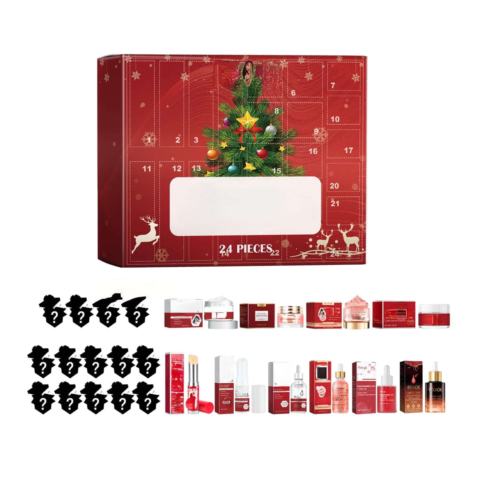 Product size: 36.3 29.8 5.8cm. Packaging size: 36.3 29.8 5.8cm. Gross weight: 1000g. Keywords: Beauty Blind Box. Product name: 24 grids beauty blind box. Net Content: 1set.
