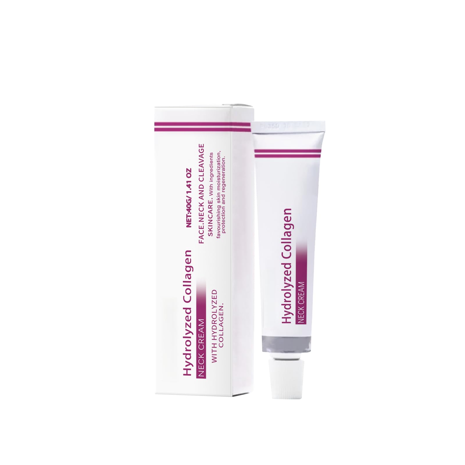 Packaging size: 13 4.1 2.7cm. Ingredients: Glycerin, Mineral Oil. Gross weight: 55g. Keywords: Reduce Neck Wrinkles, Smooth and Brighten Skin. Product name: Hydrolyzed Collagen Neck Cream. Net Content: 40G.