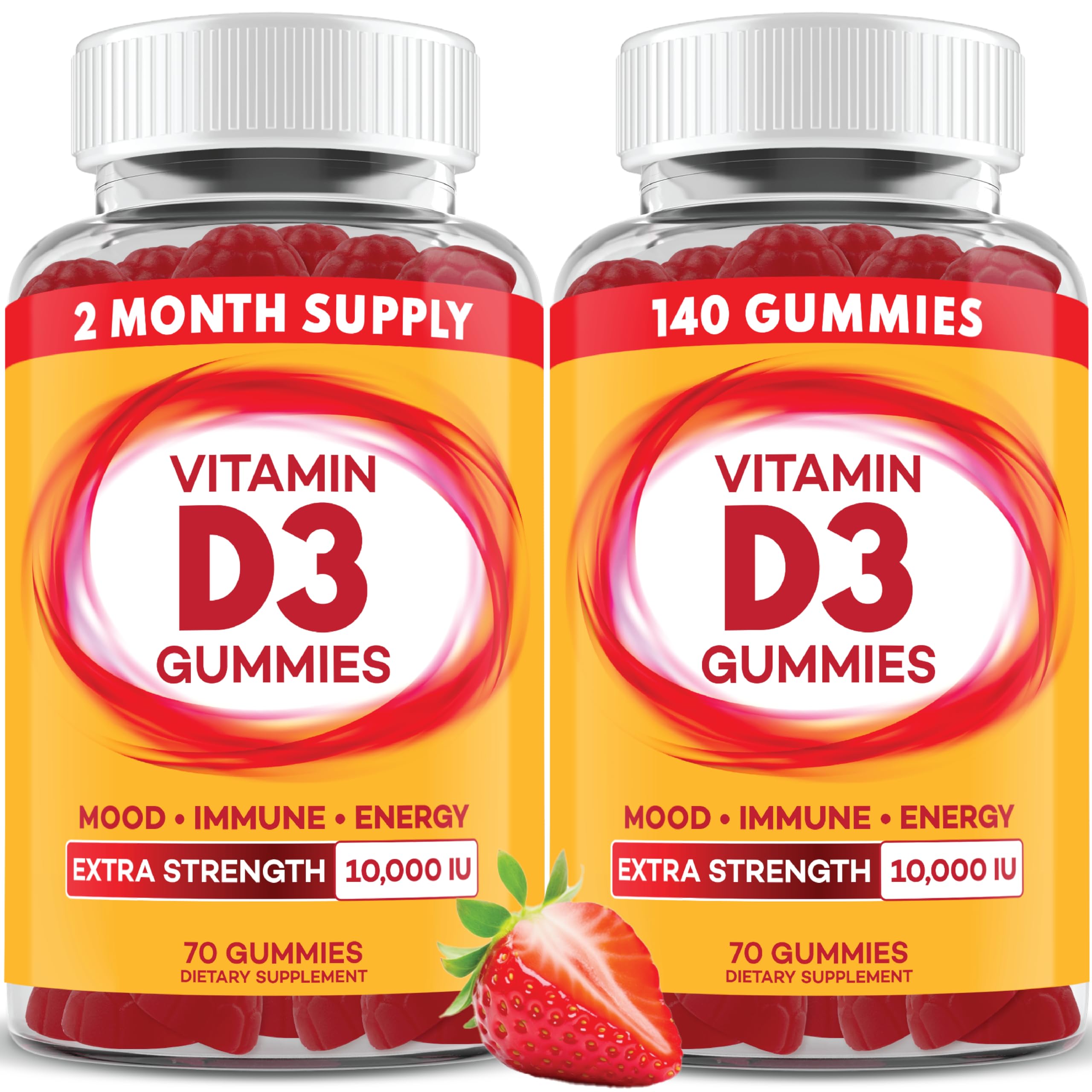 Vitamin Customizable Immune Support: Tailored for the whole family, our Vitamin D gummies offer flexibility in dosage, allowing adults and children over 4 to enjoy two gummies a day, while children under 4 can benefit from just one gummy, with the option to indulge in extra servings for an added boost in immunity, probiotic health, and a most essential vitamin intake. Trusted Quality Safety: Manufactured by a leader in nutritional innovation, our Vitamin D3 Gummies are made with premium, carefully sourced ingredients to ensure a safe and reliable dietary choice. Designed to support bone health, immune function, mood balance, and energy levels, these gummies provide essential Vitamin D3 in a high-quality, delicious, and effective formula you can trust. Vegetarian-Friendly Formula: Made with pectin instead of gelatin, our Vitamin D3 Gummies are a guilt-free choice for vegetarians seeking support for bone strength, immune defense, mood balance, and energy levels. Free from artificial additives, these delicious gummies offer essential Vitamin D3 in a clean, convenient, and easy-to-take form—helping you stay active and energized every day. Delicious Convenient: Savor the delightful berry flavor of our Vitamin D3 Gummies while getting the essential support your body needs. Packed with high-potency Vitamin D3, these gummies make it easy to support bone health, immune function, and mood balance—all in a tasty, chewable form. No pills, no hassle—just a delicious and enjoyable way to maintain your daily wellness. 140 GUMMIES 2 MONTH SUPPLY Boost your daily wellness with our Vitamin D3 Gummies, formulated with a powerful dose of Vitamin D3 to support bone strength, immune defense, and mood balance. These delicious gummies help enhance calcium absorption, promote healthy muscle function, and contribute to overall energy levels. Perfect for maintaining optimal Vitamin D levels year-round, our gummies provide a convenient and tasty way to support your body's natural defenses and overall well-being.