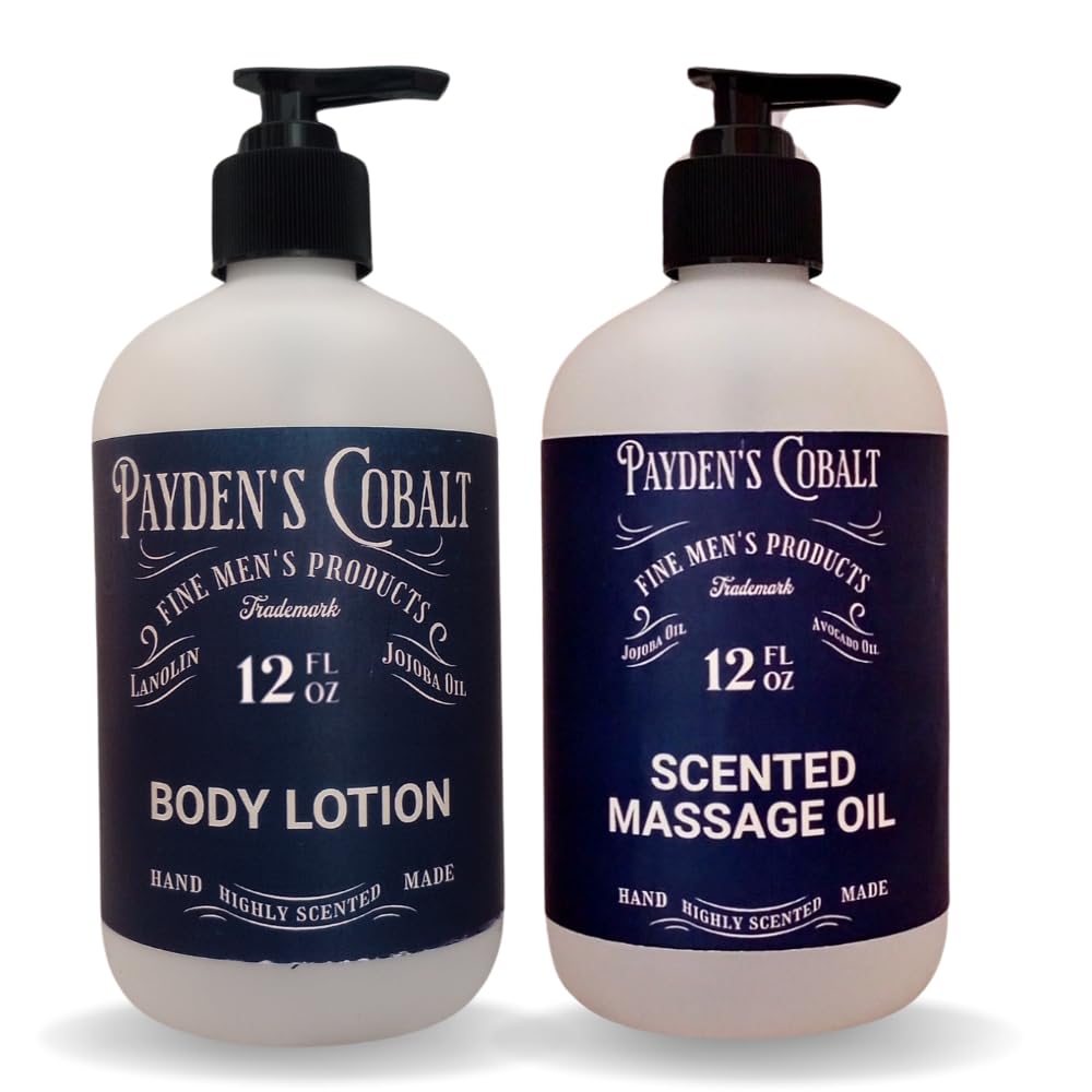 12 Oz Body Lotion - 12 Oz Massage Oil. Payden's Cobalt Scented Massage Oil. Body Lotion with Jojoba Oil and Lanolin. Payden's Cobalt Mens products by Black Canyon. SCENT: Bergamot Cedarleaf (bergamot and cedarleaf with a kick of nutmeg).
