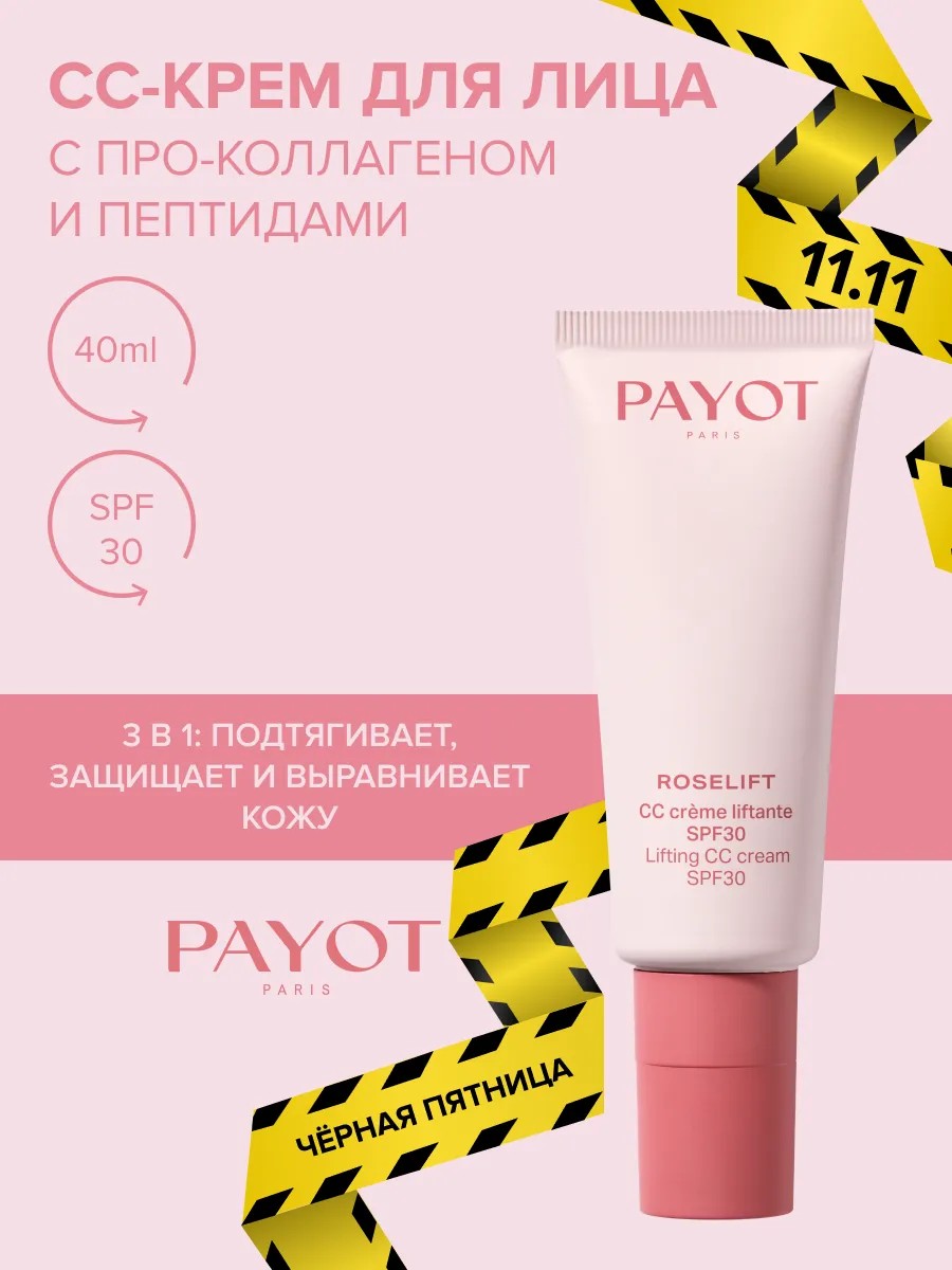 СС-крем PAYOT с эффектом омоложения "3 в 1". Обогащенная укрепляющим комплексом с проколлагеном и пептидами, эта процедура подтягивает и укрепляет кожу, обеспечивая защиту SPF 30. Универсальные пигменты-хамелеоны выравнивают цвет лица и осветляют его, проявляя свой цвет при контакте с кожей и адаптируясь ко всем оттенкам кожи. Его текстура представляет собой жидкий крем с естественным послевкусием и ощущением шелковистости.
