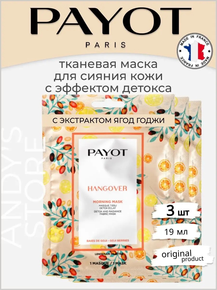 Откройте для себя Morning Masks от PAYOT – коллекцию утренних масок, призванных преобразить кожу всего за 15 минут. Тканевая маска для лица HANGOVER от Пайо с экстрактами ягод годжи, богатых витамином С, дарит коже заряд энергии и возвращает ей естественное сияние. Забудьте о последствиях вечеринок – ваша кожа будет сиять и утром! Эта тканевая маска с детокс-эффектом, возвращающая сияние и свежесть тусклой и уставшей коже. Это настоящий витаминный коктейль, который помогает коже восстановить свежий и сияющий вид. Вам непременно понравится ее гурманский фруктовый аромат с нотами персика, белого мускуса и дыни. Все маски Пайот подходят для любого типа кожи. СОВЕТ: используйте утром вместо сыворотки перед нанесением дневного ухода. ТЕХНИКА НАНЕСЕНИЯ: 1) Очистите кожу и насухо промокните ее салфеткой или полотенцем. 2) Разверните маску и удалите защитную пленку. Нанесите маску на лицо и оставьте на 15 минут. 3) Снимите маску и помассируйте кожу, чтобы остатки средства впитались. Не смывайте. Произведено во Франции.
