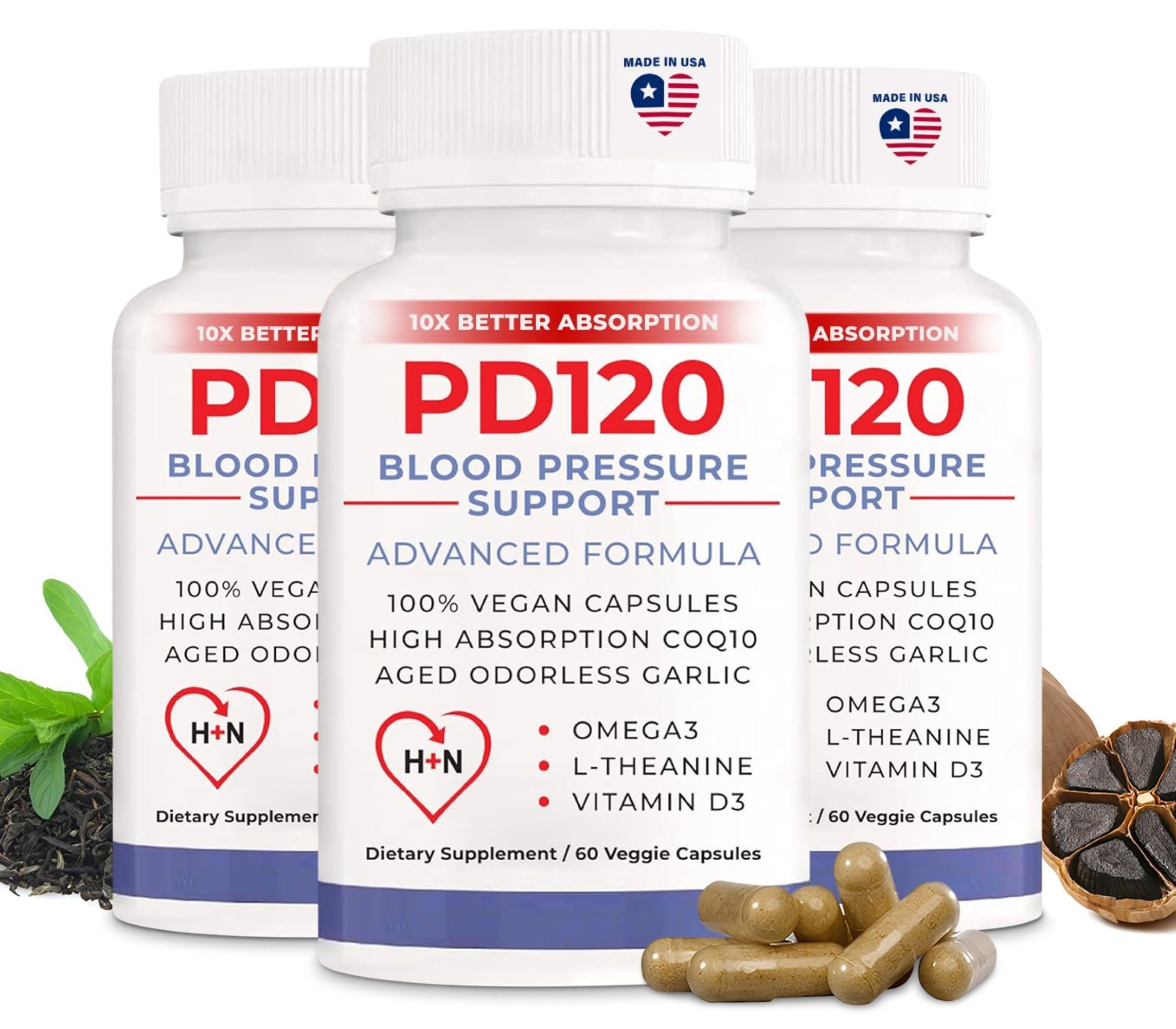 Before taking any supplements, please consult with your Physician first. MADE IN THE USA in our Good Manufacturing Practices and FDA regulated facility, you will see the difference in our quality and most importantly your results. ADD TO CART NOW. BACKED BY OUR 100 SATISFACTION GUARANTEE: At PD120 your Best health is our 1 priority. Use the entire bottle of PD120, and if you aren't happy for any reason, send it back for a FULL REFUND — No Questions Asked. 10X BETTER ABSORPTION – PD120 is made with premium ingredients that safely and naturally support healthy blood pressure. Our ingredients include the highest forms and correct amounts of Coq10 made with cyclodextrin for high absorption, Black Odorless aged Garlic, Beet root Extract, Hawthorn Extract, L theanine, Omega3, and Vitamin D3. These ingredients have been studied and shown to support healthy blood pressure. 1 CARDIOLOGIST RECOMMENDED FORM OF COQ10 — With superior absorption compared to regular CoQ10, PD120 contains 200mg of High Absorbtion CoQ10 per serving which can help you reach optimal levels of Coenzyme Q10 faster, so you can experience optimal blood pressure levels quickly. THE SAFE NATURAL HIGH BLOOD PRESSURE SOLUTION: PD120's trusted proprietary blend of enzymes, anti-oxidants, omegas, and amino acids are a Natural and Side Effect-Free solution to maintaining healthy blood pressure levels. Support healthy BP levels by using the highest quality, natural ingredients and High Absorption CoQ10.
