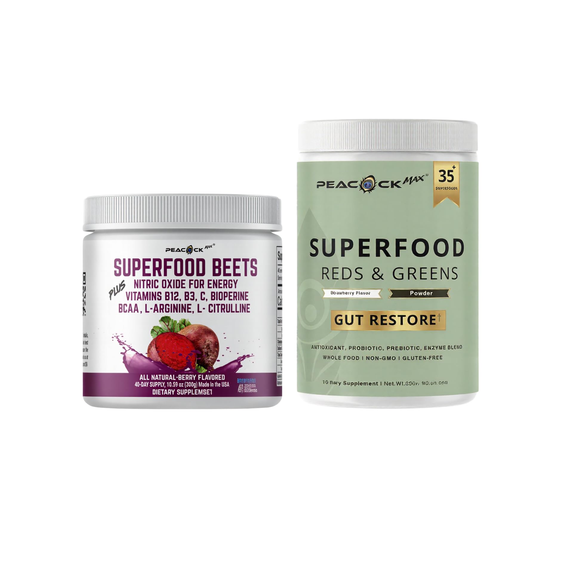 Boost your overall health and vitality with this dynamic duo from Peacock Max. This bundle includes Superfood Reds Greens Powder, packed with 35 organic plant-based superfoods like spirulina, goji berries, and ashwagandha, to enhance immunity, gut health, and energy levels. Complementing it is the Beet Root Powder, a natural nitric oxide booster designed to support blood flow, heart health, and circulation, enriched with green tea extract and antioxidants. Together, these premium supplements deliver comprehensive nutrition for your active lifestyle.Convenient Versatile: Mix these unflavored powders into your favorite recipes, smoothies, or beverages for an easy way to integrate powerful nutrition into your daily routine. Perfect for men, women, and kids. Trusted Quality Purity: Made in GMP-certified facilities in the USA, these supplements undergo rigorous third-party testing to ensure premium quality, safety, and potency. Enhanced Energy Recovery: Whether for meal replacement, smoothies, or pre post-workout nutrition, these powders provide sustained energy and faster muscle recovery, perfect for busy lifestyles. Clean, Non-GMO Ingredients: Both powders are made with clean, allergen-free formulas. They are USDA-certified, non-GMO, and free from fillers, gluten, soy, dairy, and artificial additives for peace of mind. Comprehensive Nutrition for Total Wellness: Enjoy the benefits of 35 organic superfoods and natural nitric oxide production in one bundle. Enhance immunity, gut health, energy, and blood circulation with these powerful supplements.