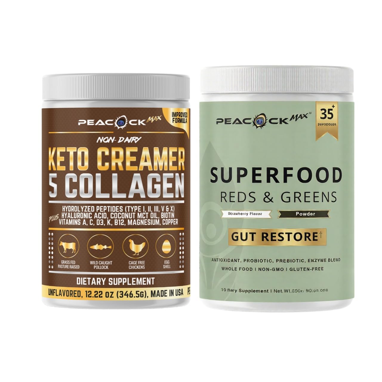 Peacock Max Collagen Keto Creamer & Superfood Reds and Greens Powder Bundle Hydrolyzed Collagen with MCT & Organic Superfoods with Probiotics & Enzymes