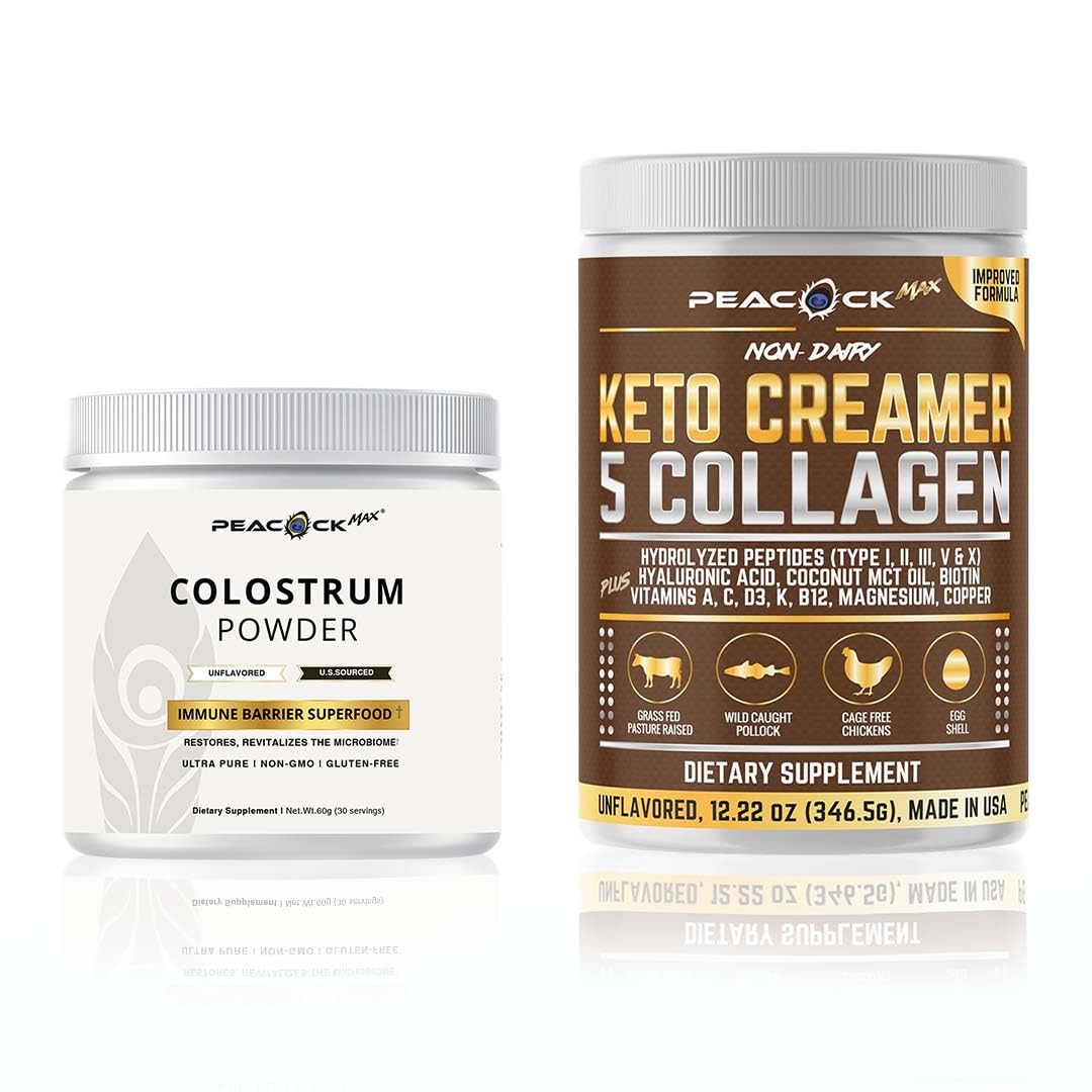 Fuel your day with the Peacock Max Collagen Keto Coffee Creamer Colostrum Powder Bundle - a nutrient rich pairing created for those who value clean, functional nutrition. Our Collagen Keto Coffee Creamer Powder (12.2 oz) combines hydrolyzed collagen peptides, coconut-derived MCT oil, vitamin B12, and magnesium to deliver a smooth, unflavored boost of protein and sustained energy. It's an easy way to enhance your morning coffee, shakes, or baking recipes without sugar or carbs—ideal for keto, low-carb, or active lifestyles. Complementing it is our Peacock Max Colostrum Powder (60g, 30 servings), made from pure bovine colostrum—a natural source of protein and key nutrients. This unflavored powder mixes easily into beverages or recipes, offering a simple, flexible way to support balanced daily nutrition. Free from GMOs, gluten, soy, sugar, casein, and fillers, it's a clean addition to your wellness routine. Together, these two formulas provide a convenient way to elevate your nutrition and keep your wellness goals on track. Produced in U.S. based cGMP certified facilities and third-party tested for purity, Peacock Max ensures every product meets rigorous quality standards - so you can feel confident in what you're taking every day.Quality You Can Trust: Crafted in the USA in cGMP-certified facilities, every batch is tested for purity and consistency. Peacock Max products reflect a commitment to quality, transparency, and reliable nutrition. Versatile Easy to Mix: Both powders dissolve smoothly into coffee, smoothies, or recipes without affecting taste or texture—making them effortless to include in your morning routine or post-workout nutrition. Pure Colostrum Supplement: Each serving of our unflavored colostrum powder provides a natural source of essential nutrients and protein, made from pure bovine colostrum—free from gluten, GMOs, soy, and artificial additives. Collagen MCT Blend: The Collagen Keto Coffee Creamer Powder delivers hydrolyzed collagen peptides with coconut MCT oil, B12, and magnesium, an unflavored, sugar-free way to add clean protein and sustained energy to your coffee or shakes. Dual Superfood Nutrition: Experience the benefits of collagen and colostrum together—two powerhouse supplements designed to support overall wellness, daily energy, and balanced nutrition in one convenient virtual bundle.