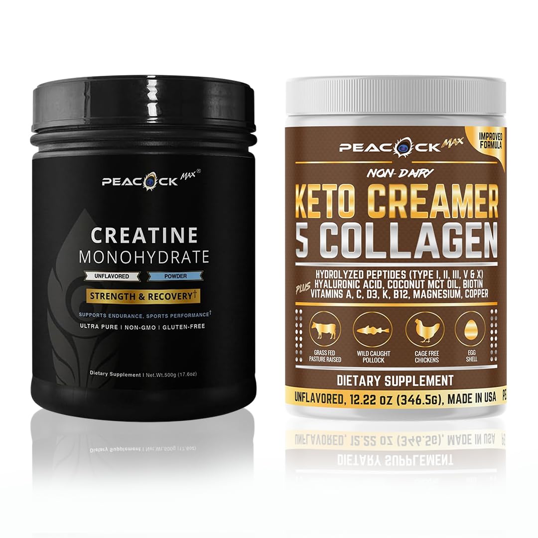 Peacock Max Creatine Monohydrate Powder (500g) and Collagen Keto Coffee Creamer Powder (12.2 oz) Bundle - Unflavored Gluten-Free Non-GMO Lactose & Soy Free