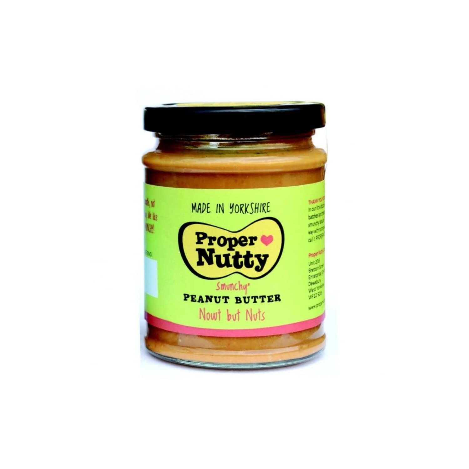 We put our passion into creating an innovative benchmark in flavor and texture for our handcrafted peanut butter and are well nourished by every little jar that has a big heart full of natural goodness! Not quite smooth, not quite crunchy, our peanut butter is carefully prepared and freshly roasted in our small Yorkshire factory, then nibbled to perfection. There's nothing added that shouldn't be there the taste of the sweet life for that pinch of nut that's in all of us! - "Now but Nuts": 100 peanut butter. Any peanut oil that may rise to the surface is natural and simply needs shaking. Palm oil free. Suitable for vegans. INGREDIENTS 100 Peanuts Any peanut oil that may accumulate on the surface is natural and simply needs shaking. Palm oil free.