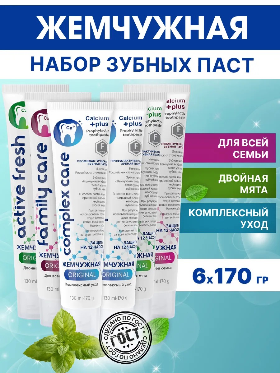 Зубная паста Набор 6 шт * 170 гр - Двойная мята 2 шт, Для всей семьи 2 шт, Комплексный уход 2 шт. Зубная паста отбеливающая, против кариеса Жемчужная отлично очищает, бережно отбеливает и полирует эмаль. Сохраняет длительную свежесть дыхания и обладает ярким и свежим ароматом перечной мяты. Зубная паста Жемчужная Для всей семьи подходит для детей от 7 лет. Зубные пасты совмещают ежедневный уход и профилактику с мягким отбеливанием при условии регулярного двухразового использования утром и вечером. Ультракомплекс активных элементов в составе пасты обеспечивает защиту зубов и десен, быстро и эффективно уничтожает налет и бактерии, которые являются источником неприятного запаха. Средство в удобной тубе и максимально выгодным объемом 170 грамм. Универсальная женская и мужская чистящая косметика для зубов с безопасным органическим составом, с хорошим пенообразованием, сохранением свежести и мятного аромата на протяжении длительного времени, Проверенная многими курильщиками формула эффективно и безопасно удаляет табачный, кофейный, чайный налет, возвращает зубам натуральную белизну и здоровье. Гигиенический уход препятствует появлению кариеса и зубного камня. Зубная паста освежает дыхание уникальным мятным ароматом. Зубная паста от налета, для предупреждения образования зубного камня, воспаления и кровоточивости десен, для антибактериального и противовоспалительного действия, она идеально подходит как средство для ухода за зубами при ношении брекетов. Все зубные пасты подходят для ежедневной гигиены полости рта и имеют безопасный состав, подходят беременным и кормящим женщинам. Они обеспечивают укрепление и восстановление зубной эмали, дарят свежесть дыхания и легкий косметический эффект, даря красоту зубам и здоровье деснам. Идеальный подарок близким людям с заботой об их здоровье - для мамы и папы, бабушки и дедушки, подруги и друга. У нас есть акции и распродажи, вы можете купить наши товары в подарок со скидкой!