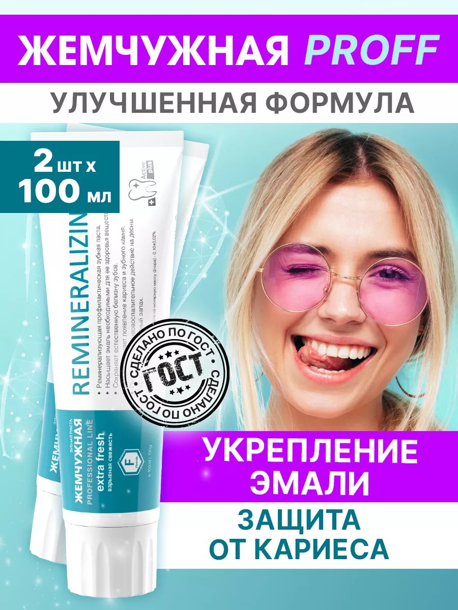 Зубная паста 2 шт по 100 мл Жемчужная Реминерализующая эффективно воздействует на эмаль зубов и десны, обладает противовоспалительным и антимикробным действием. Благодаря высокому содержанию минералов и натуральных экстрактов, она активно минерализует эмаль, укрепляет её и способствует восстановлению. Паста профилактическая Жемчужная Реминерализующая PROFF идеально подходит для взрослых и подростков старше 14 лет. Эффективно борется с зубным камнем и налетом, обеспечивает мягкое отбеливание зубов до их естественного оттенка, паста идеальна для курящих и любителей кофе. Зубная паста с фтором и кальцием эффективно борется с кариесом и зубным камнем и помогает реминерализировать эмаль. Она обладает мягким мятным вкусом и подходит для чувствительных зубов. Даже беременные могут использовать эту пасту, так как она абсолютно безопасна и не содержит вредных веществ. Компактная упаковка в 100 мл позволяет использовать пасту как дома, так и взять её с собой в любое путешествие. Попробуйте российское качество и заботу о здоровье своих зубов с Жемчужной Реминерализующей зубной пастой. Зубная паста реминерализирующая.