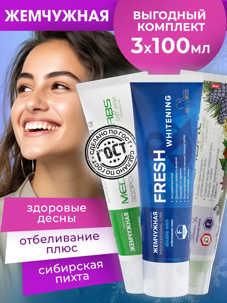 Набор зубных паст Жемчужная отбеливающая, от кровоточивости десен и против кариеса. Вложение 3 шт по 100 мл.