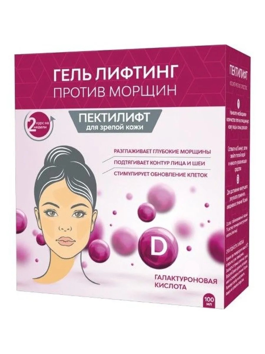 PECTILIFT ANTI-WRINKLE LIFTING GEL FOR MATURE SKIN 100ML/2-WEEK COURSE PECTILIFT ANTI-WRINKLE LIFTING GEL FOR MATURE SKIN - 2-WEEK COURSE - a natural polymer of galacturonic acid with an ultra-high degree of purification. Meets all the requirements of purity, efficiency and safety. Modern technology for processing plant components eliminates the risk of allergies. Has an excellent stimulating and toning effect on the skin. Removes signs of fatigue. Improves complexion. Properties: Lifting effect on the skin - due to the high content of galacturonic acid, it has a pronounced lifting effect; smooths out deep wrinkles; tightens pores; prevents the loss of elastic fibers in the skin. Regeneration: penetrates microdefects of the skin, causing increased formation of collagen and elastin; Stimulates natural skin cell renewal; tones and energizes the skin. Cleansing action - has a gentle exfoliating effect (removes dead cells of the stratum corneum); prevents the appearance of age spots. Protective action - protects the skin; has a bactericidal (antimicrobial) effect; normalizes the skin's pH. Apply the required amount of gel to cleansed skin of the face and décolleté. Leave on for 15 minutes, then rinse with warm water and apply a moisturizer. For best results, use daily for 14 days (at least 2 weeks).