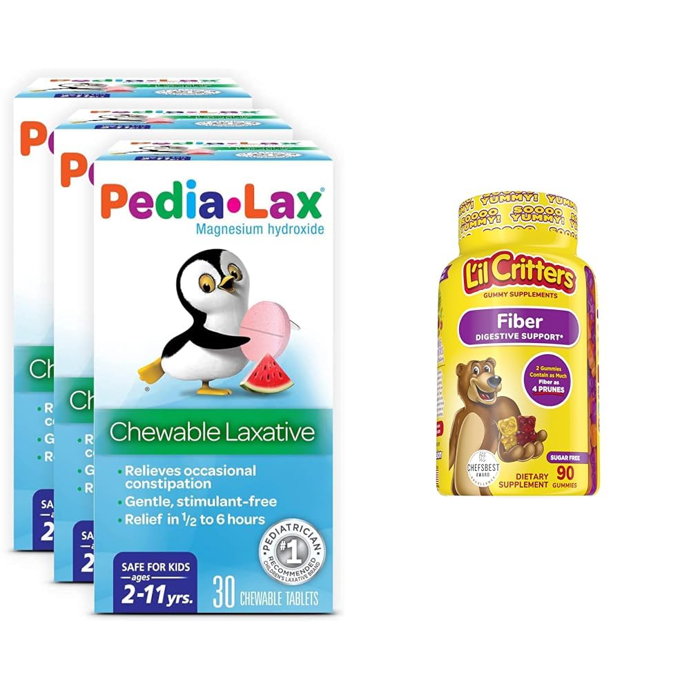 Convenient bundle combines stimulating-free laxatives and tasty fiber gummies to gently relieve and prevent kids' occasional constipation. L'il Critters gummies have no high-fructose corn syrup, synthetic dyes, dairy or gluten. Includes 90 L'il Critters gummy fiber supplements in delicious berry and lemon flavors containing 3g of fiber per serving to support kids' digestive health. Contains 90 total Pedia-Lax laxative chewable tablets in 3 packs, with watermelon flavor that kids enjoy taking. Pedia-Lax is the 1 pediatrician-recommended children's laxative brand for providing kids ages 2-11 gentle relief from occasional constipation in 30 minutes to 6 hours. .