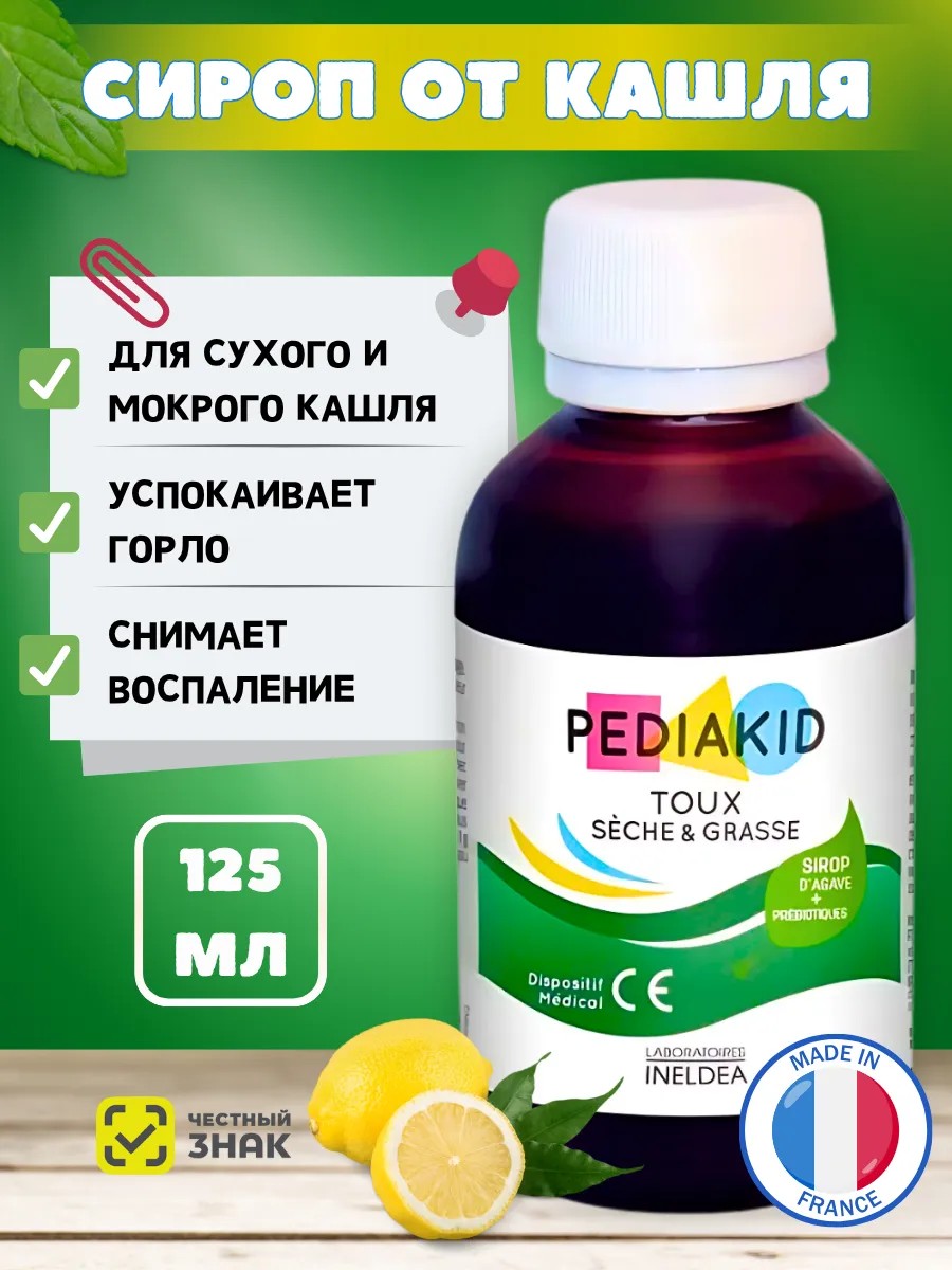 PEDIAKID Toux Sèche & Grasse идеально подходит для детей от 6 месяцев. Это эксклюзивная формула, изготовленная из растительного глицерина и растительных экстрактов, предназначенная для облегчения кашля и успокоения горла. Бифидогенный пребиотик, который очень хорошо переносится детьми. Растительный глицерин: Смазывающие, увлажняющие и смягчающие свойства, способствующие разжижению слизи и физиологической мокроты. Известен своим успокаивающим и защитным действием на раздраженные слизистые оболочки, чтобы уменьшить сухой кашель. Также PEDIAKID Toux Sèche & Grasse содержит экстракты растений традиционно используемые при облегчения кашля (тимьян, подорожник, плющ, бессмертник). С восхитительным натуральным лимонным вкусом. Плюс продукта Эксклюзивная инновация: нектар агавы. Изделие, предназначенное для облегчения кашля (сухого и жирного), особенно когда кашель связан с инфекцией верхних дыхательных путей, в соответствии с приложением европейской директивы 9342CE Classe I. В комплекте мерный колпачок Успокаивает кашель (сухой или жирный) Снимает раздражение горла Содержит растительные экстракты (тимьян, подорожник, плющ) Противопоказания: индивидуальная непереносимость компонентов, беременность, кормление грудью.