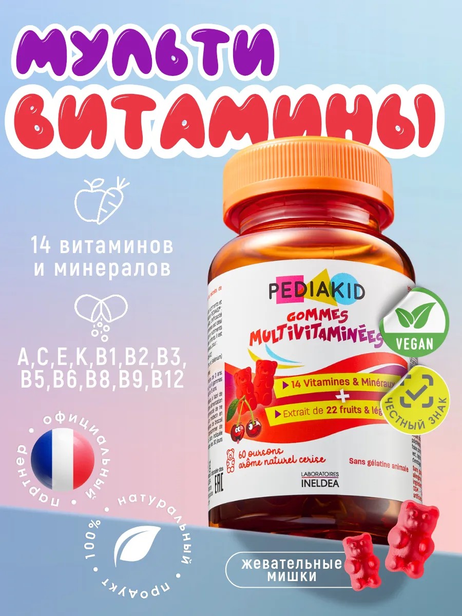 Pediakid Multivitamines Gommes — это натуральный поливитаминный комплекс для детей с 3 лет, представленный в виде жевательных мармеладок в форме медвежат. Каждая мармеладка содержит 14 витаминов и минералов, включая витамины A, C, D, E, K, B1, B2, B3, B5, B6, B8, B9, B12, а также селен и цинк. Дополнительно, продукт обогащен эксклюзивным экстрактом из 22 фруктов и овощей, что обеспечивает полноценное поступление микроэлементов, способствующих нормализации обмена веществ и поддержанию иммунной системы.