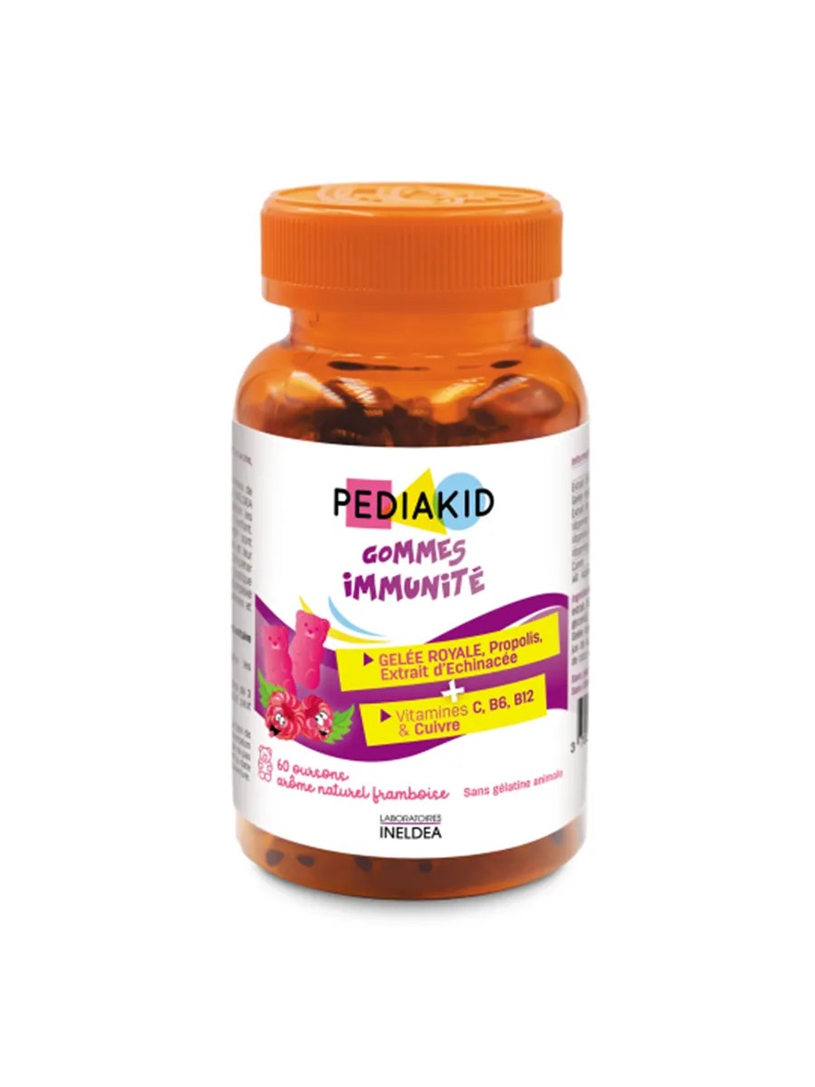 Propolis, a resinous substance produced by bees, has bactericidal properties. To help strengthen children's immunity, Pediakid has developed a food supplement, Pediakid Gommes Immunité, in the form of gummy bears and with raspberry flavor! These chewable multivitamins, presented in toy form, are a favorite among children and their parents.