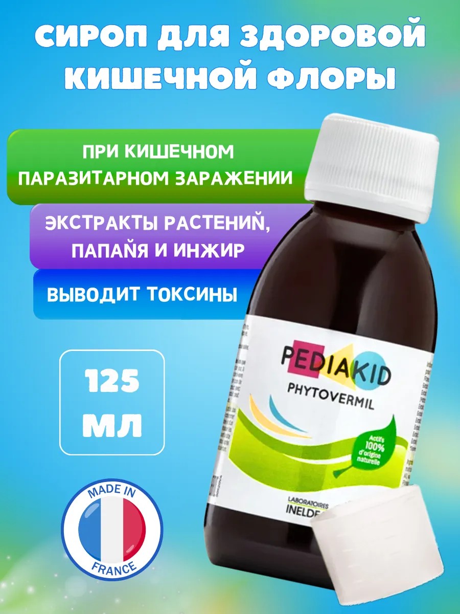 Педиакид Фитовермил (Phytovermil) - это добавка к пище на основе растительных экстрактов (тимьян, ромашка, инжир, тыква, имбирь, чеснок и грецкий орех) и папайи. Зуд, беспокойство по ночам ... а что, если это кишечное паразитарное заражение (острицы…)? Часто встречается у детей, но об этом можно легко позаботиться — мягко и естественно.PEDIAKID Phytovermil специально разработан на основе экстрактов растений и папайи для поддержки здоровой кишечной сферы без паразитов. Его формула на основе тимьяна, ромашки, инжира, имбиря, папайи, чеснока и грецкого ореха способствует правильному функционированию кишечной системы. PEDIAKID Phytovermil слегка приправлен вкусом красных фруктов, можно принимать для профилактики, при сезонных изменениях или в качестве лекарства при необходимости. Экстракты растений (тимьян, ромашка, инжир, тыква, имбирь, чеснок и грецкий орех) и папайя. Мягка и естественная альтернатива — Курс приема 12 дней. Противопоказания: индивидуальная непереносимость компонентов, беременность, кормление грудью.