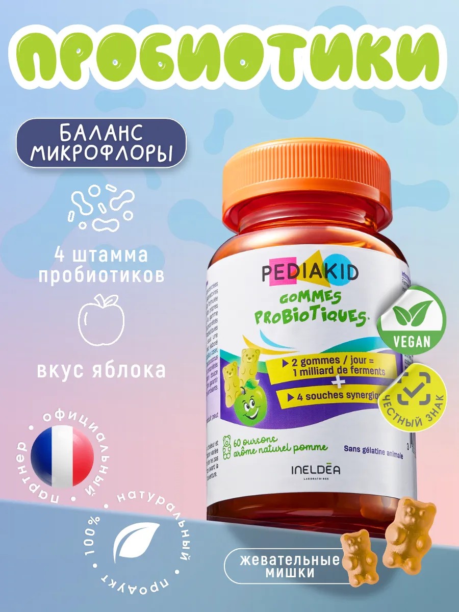 Пробиотики для детей от Педиакид в виде желейных мишек изготовлены во Франции содержат 3 вида лактобактерий и ферменты для улучшения пищеварения детей с 3х лет.