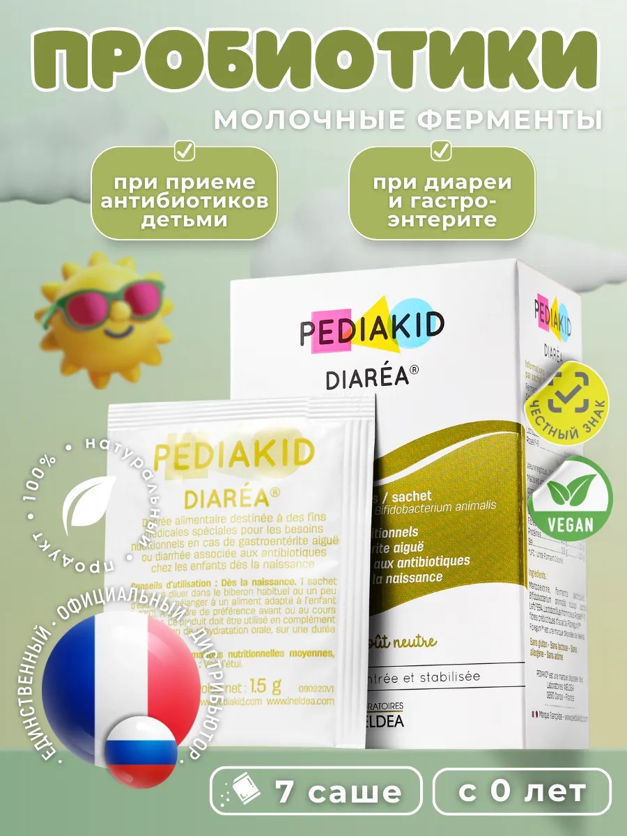 PEDIAKID DIAREA содержит пребиотики и пробиотики, которые способствуют нормализации пищеварения, улучшают состояние кишечника и помогают организму бороться с инфекциями.