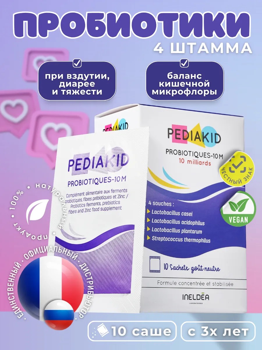 PEDIAKID -10M ПЕДИАКИД Пробиотик имеет приятный вкус и легко усваивается организмом. Он не содержит искусственных красителей, ароматизаторов и консервантов, что делает его безопасным для детей. Продукт рекомендуется принимать как профилактическое средство для поддержания здоровья, а также при лечении дисбактериоза и других проблем с пищеварением.