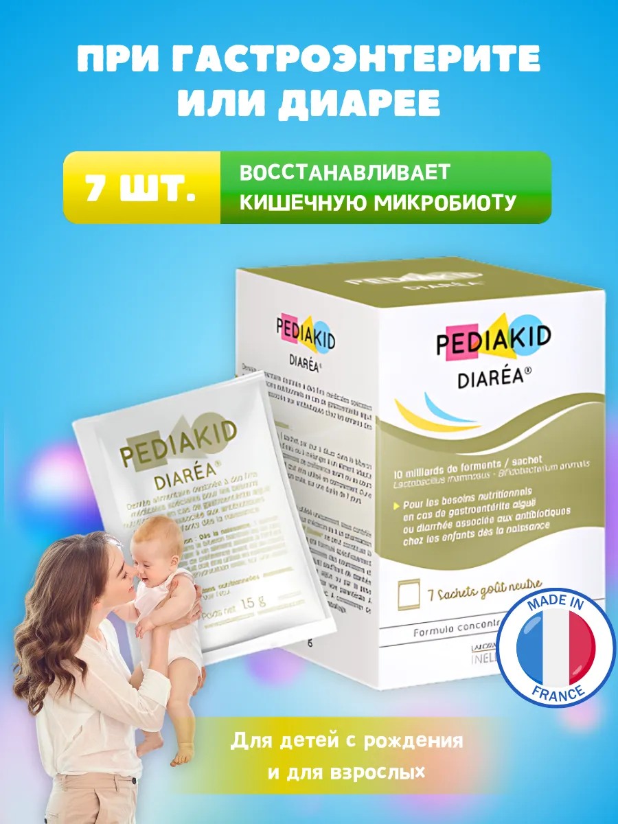 Dietary supplements for special medical purposes, in cases of acute gastroenteritis or diarrhea associated with antibiotic use. One sachet contains 10 billion lactic enzymes, which promote the growth of beneficial bacteria in the intestines, helping to restore the intestinal microbiota disrupted by the invasion of microbes that cause diarrhea. Good bacteria replace those that interfere with transit, thereby significantly reducing stool frequency. The product's advantage is its exclusive innovation: "Concentrated and stabilized formula." The selection of strains and the production process of PEDIAKID Diaréa have been specially studied to guarantee the perfect stability of the 10 billion enzymes throughout the product's shelf life, without the need for refrigeration. Contraindications: individual intolerance to the components, pregnancy, breastfeeding. Weight of one sachet (1.5 g).