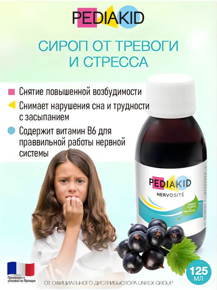 БАД PEDIAKID NERVOSITE рекомендуется детям с 3 лет для улучшения психоэмоционального состояния и помощи в преодолении повседневных стрессов. Упаковка содержит 125 мл сиропа.