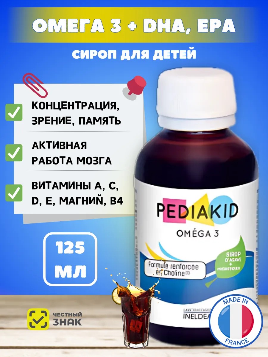 Добавка к пище в виде сиропа, на основе DHA природного происхождения, а также содержит витамины C-A-E-D, магний и фосфор. Педиакид Омега 3 (Pediakid Omega 3) разработан специально для детей, обеспечивая их организм питательными веществами, поддерживающими сбалансированное развитие и здоровый рост. Этот сироп улучшает память и концентрацию внимания; обеспечивает профилактику сердечно-сосудистых заболеваний; поддерживает здоровую активность мозга; улучшает остроту зрения. Богат жирными кислотами Омега-3 и DHA, которые поддерживают правильную работу когнитивных функция (память, концентрация, зрение). Содержит витамины A, C, D, E. Эксклюзивная инновация: нектар агавы.Сироп агавы – это сахар растительного происхождения, полученный из кактуса агавы, растущего на вулканических почвах Мексики, он более мягкий и менее густой, чем мед. Состоит из натуральных нерафинированных сахаров, что придает ему диетические качества: его гликемический индекс ниже, чем у других рафинированных сахаров, а также в меньшей мере вызывает кариес. Противопоказания: индивидуальная непереносимость компонентов.