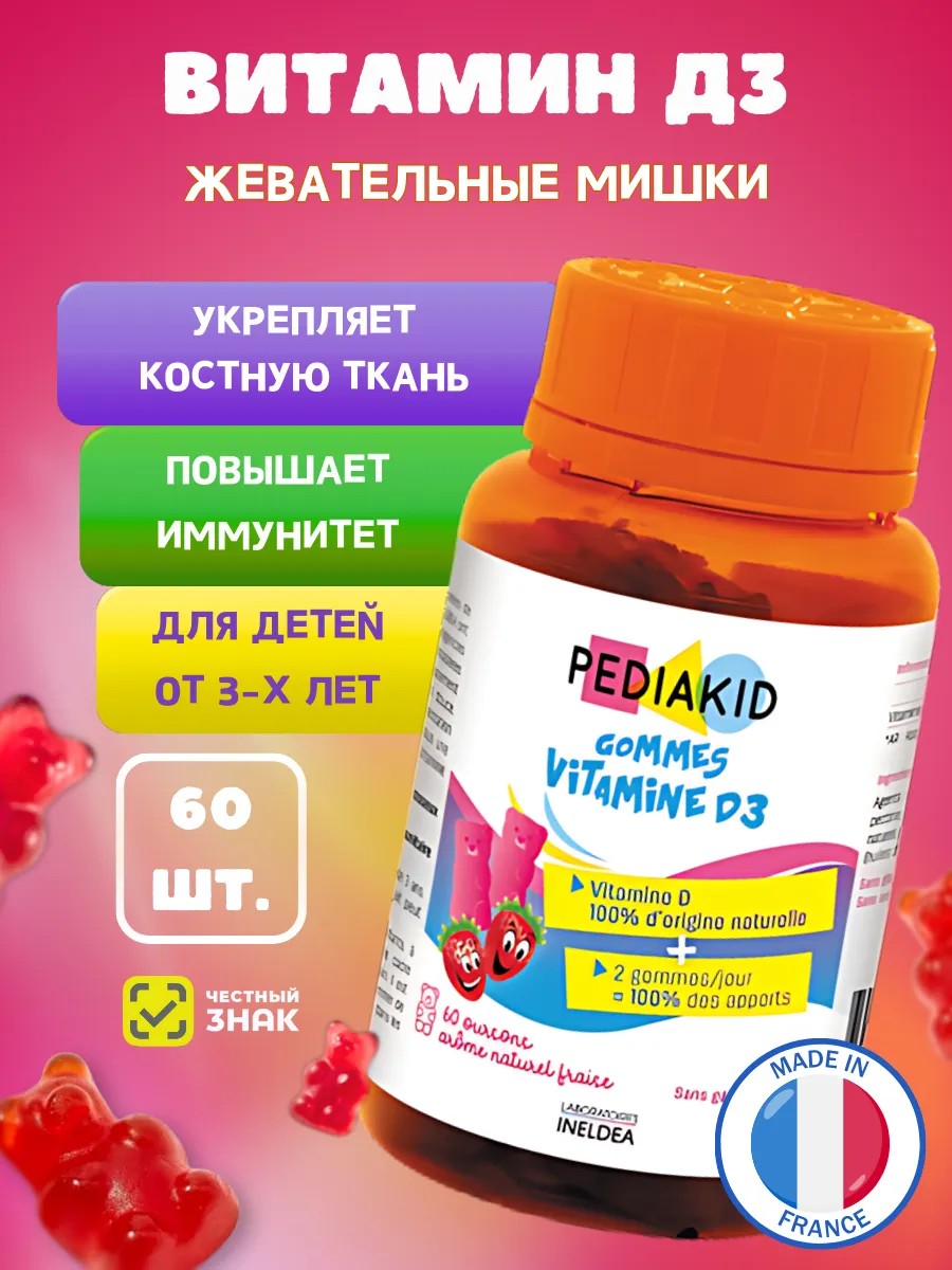 Добавка к пище в виде жевательных мишек-мармеладок с витамином D3 натурального происхождения.p Богат витамином D3, 100% натурального происхождения, PEDIAKID Vitamin Gommes D3 Способствует усвоению кальция и фосфора в костях и зубах. Витамин Д, или «солнечный витамин», помогает сохранить крепкие кости и зубы. Согласно исследованиям, у 80% населения наблюдается дефицит витамина D, поэтому крайне важно оптимизировать поступление питательных веществ. PEDIAKID Gommes D3 природного происхождения специально разработан для обеспечения и оптимального усвоения кальция и фосфора, а также для укрепления естественных защитных сил. созданный в форме игрушек – жевательных мультивитаминов, очень нравятся детям и их родителям. Для наилучшего усвоения не содержит искусственных ароматизаторов и красителей, также не содержит глютен и лактозу. Богат Витамином D3 натурального происхождения (покрывает 100% потребности организма). Рост и развитие. Созданный в “игровой" форме жевательный Витамин D очень нравятся детям и их родителям. PEDIAKID Gommes Vitamine D3 Жевательный мармелад Витамин D3 разработан на основе яблочного пектина. Не содержит желатин, без консервантов, без глютена, без лактозы, без искусственных вкусовых добавок и красителей. Противопоказания: индивидуальная непереносимость компонентов, беременность, кормление грудью. Перед применением стоит проконсультироваться с врачом. Перед применением детьми рекомендуется проконсультироваться с врачом-педиатром. Детям до 14 лет принимать БАД по согласованию и под наблюдением врача педиатра.