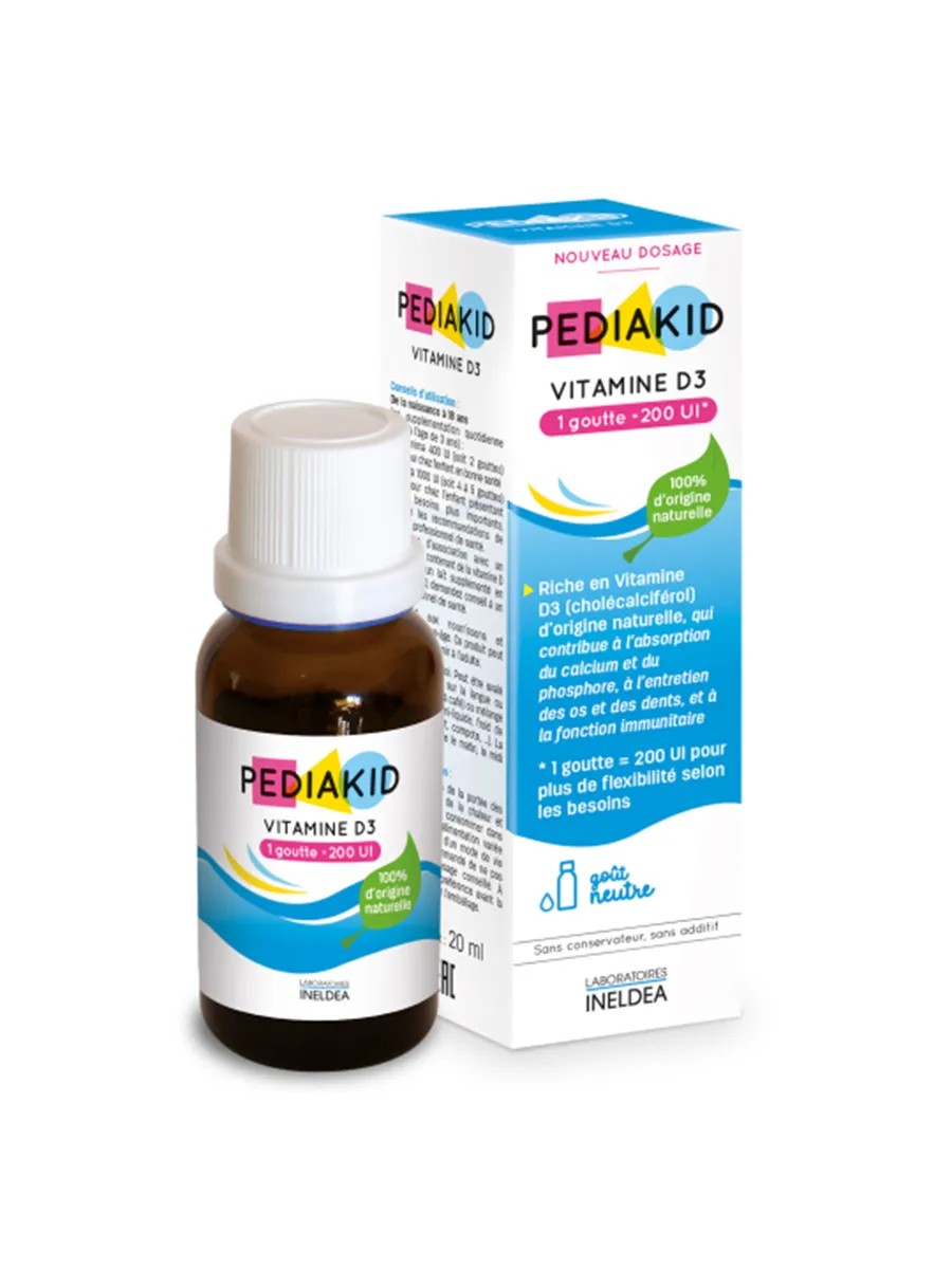 PEDIAKID Vitamine D3 of natural origin is specially formulated to ensure optimal absorption of calcium and phosphorus, as well as to strengthen the child's natural defenses.