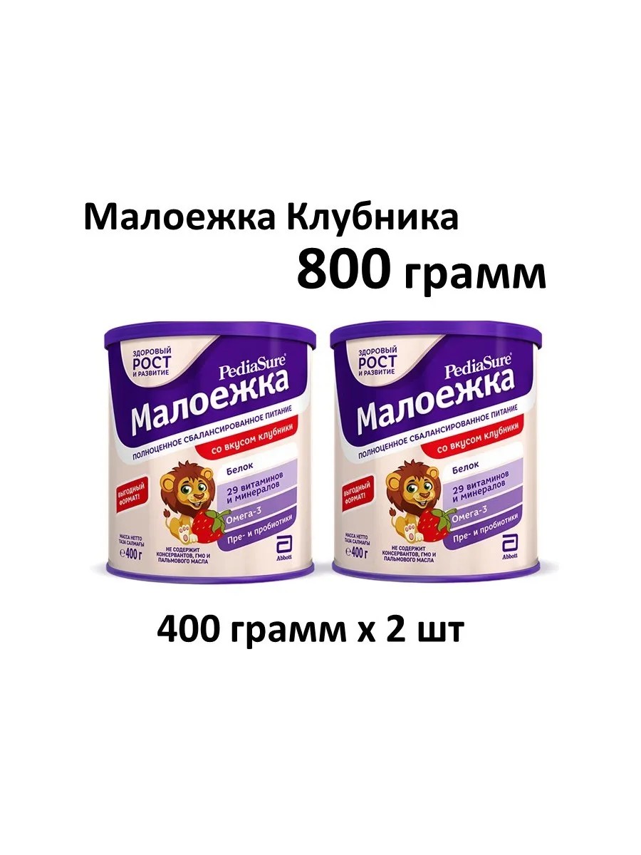 Сбалансированное питание для детей Малоежка доступно в двух вариантах: готовый напиток (200 мл) удобно взять с собой, сухая смесь для приготовления напитка–экономичный формат для дома (400 г=8 порций, 850 г=17 порций). Выберите любимый вкус полезного перекуса: ваниль, клубника, банан, шоколад или натуральный****.