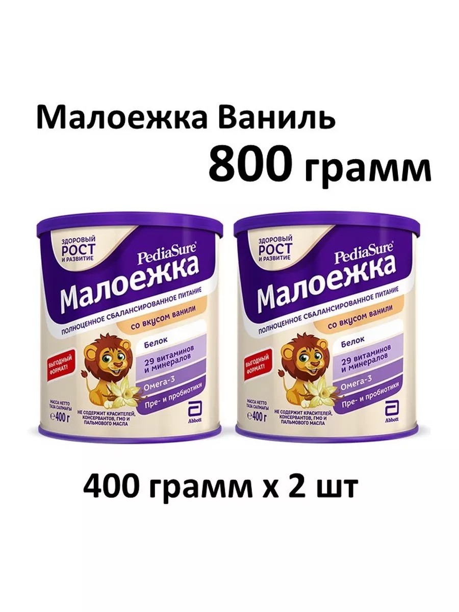 Сбалансированное питание для детей Малоежка доступно в двух вариантах: готовый напиток (200 мл) удобно взять с собой, сухая смесь для приготовления напитка–экономичный формат для дома (400 г=8 порций, 850 г=17 порций). Выберите любимый вкус полезного перекуса: ваниль, клубника, банан, шоколад или натуральный****.