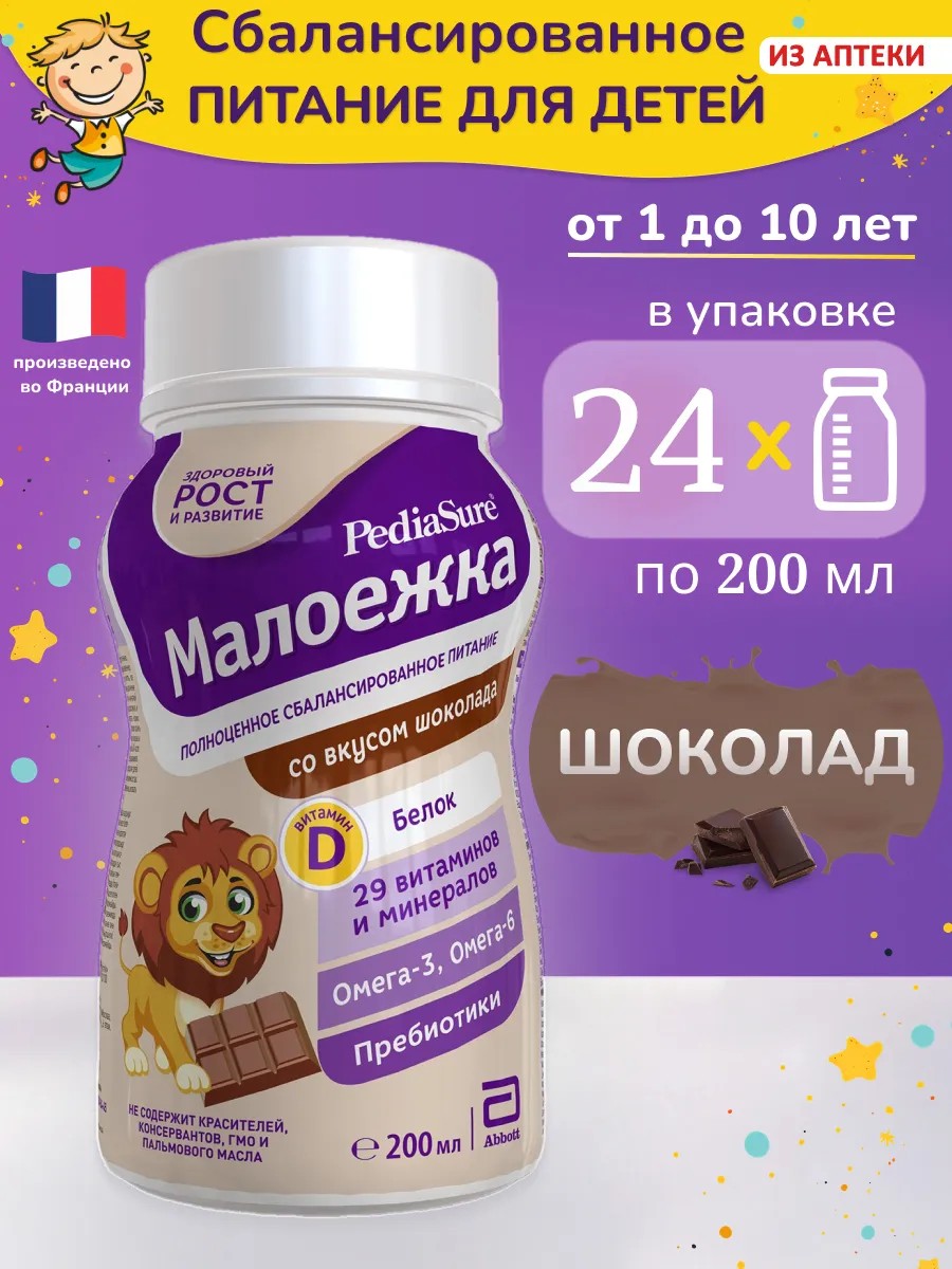 PediaSure Малоежка - вкусный питательный напиток, который обеспечивает полноценное и сбалансированное питание для детей от 1 года до 10 лет. Дополняет несбалансированный рацион необходимыми веществами для здорового роста, развития и укрепления иммунитета.