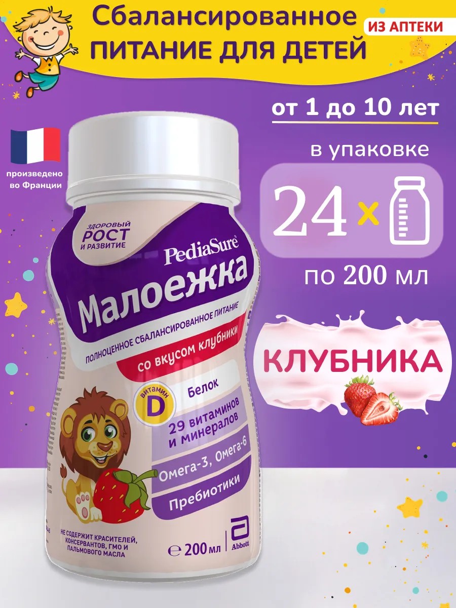 Малоежка клубника 24 штуки. Полезный напиток для детского питания готов к употреблению. Перед употреблением хорошо взболтать. Открыть непосредственно перед использованием. Рекомендуется употреблять комнатной температуры или охлажденным. Не кипятить, не разогревать в микроволновой печи.