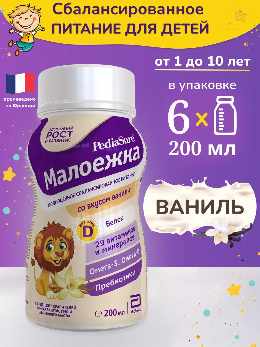 PediaSure Малоежка - вкусный питательный напиток, который обеспечивает полноценное и сбалансированное питание для детей от 1 года до 10 лет. Дополняет несбалансированный рацион необходимыми веществами для здорового роста, развития и укрепления иммунитета.