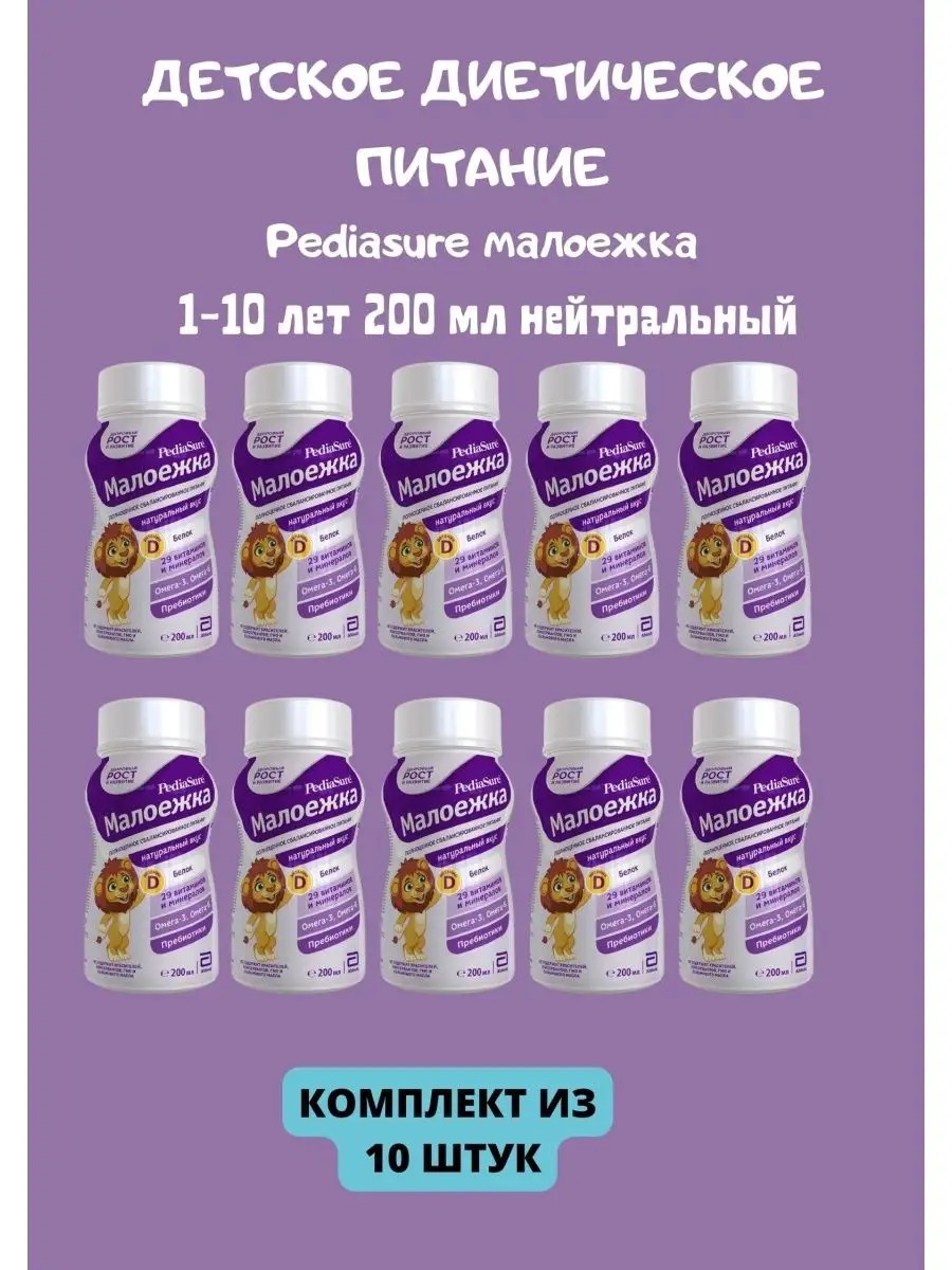 это специализированный пищевой продукт детского диетического питания, жидкая смесь - Pediasure Малоежка - это вкусный питательный напиток, который дополняет несбалансированную еду питательными веществами, чтобы ребёнок получал всё необходимое для здорового роста и развития. Сбалансированный состав: 200 ккал во флаконе. Белок (6г на 200 мл) - для роста костей и мышц. Жиры - для энергии. 29 важнейших витаминов и минералов - для здорового роста и развития организма. омега-3 жирные кислоты - для развития мозга, зрения и иммунной системы. Пребиотики- для здорового пищеварения, нормализации микрофлоры и иммунитета. Клинически доказанная эффективность при регулярном потреблении 2 бутылочек в день. Смесь не содержит красителей, консервантов, ГМО, пальмового масла и глютена. Подходит для детей с повышенной чувствительностью к лактозе и ее непереносимостью. Не требует специальных условий хранения до момента открытия бутылочки. Продукт полностью готов к употреблению. Перед употреблением хорошо взболтать. Рекомендуется употреблять комнатной температуры или охлажденным. Подходит для питания детей от 1 года. Не является молочным продуктом, но содержит белок коровьего молока. Применяется при: несбалансированном рационе питания, если ребенок отказывается от еды или ест очень мало, отсутствие в рационе важных групп продуктов: мясо, овощи, молочные продукты, повышенные нагрузки, усталость, вялость, повышенные физические нагрузки, низкий вес. Можно применять как здоровый перекус для ребенка после занятий спортом или прогулки, брать с собой в дорогу, школу. Питательную смесь можно использовать как дополнение к основному рациону: 1 бутылочка может заменить 1 дополнительный прием пищи (второй завтрак или полдник).