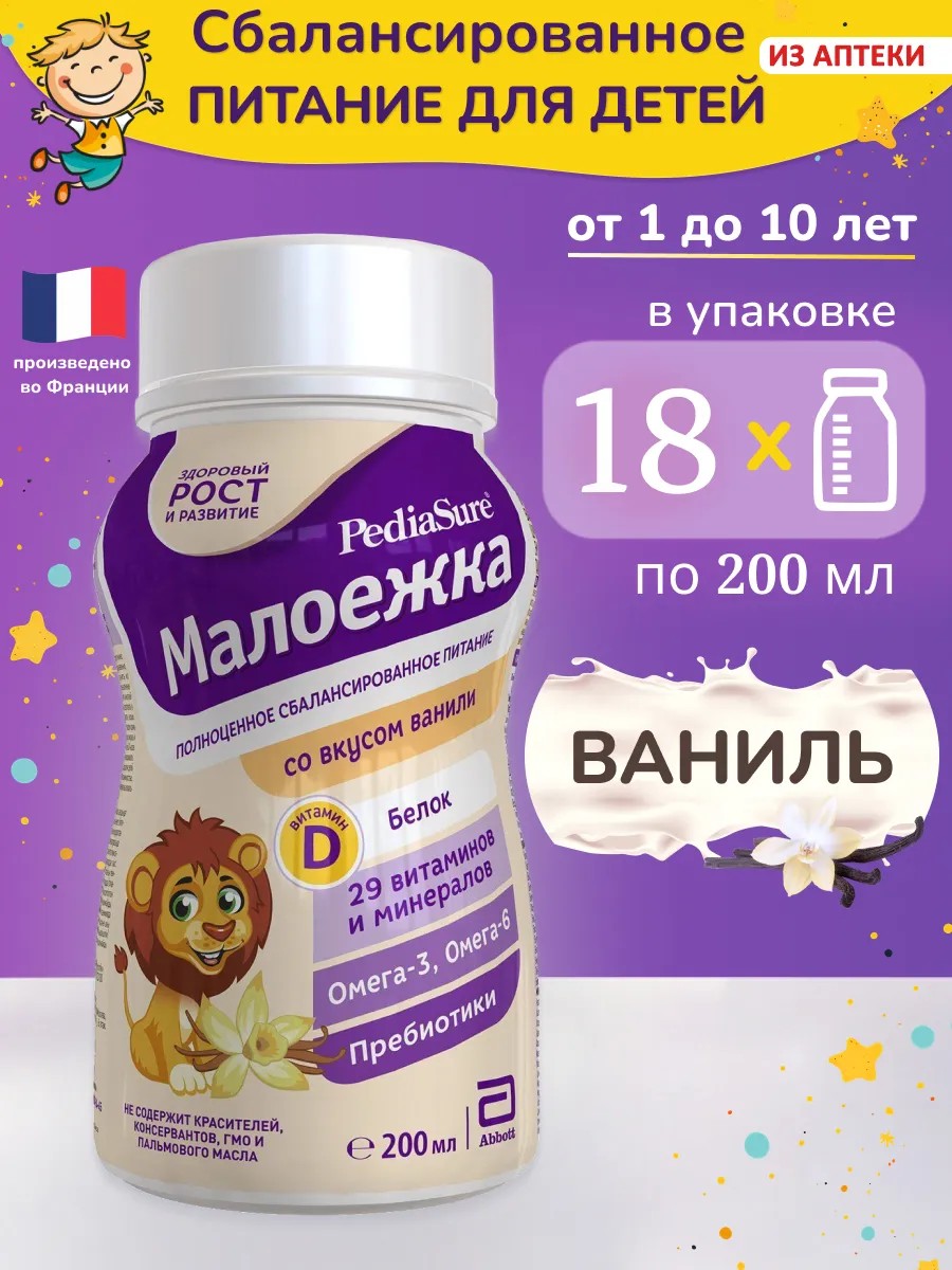 PediaSure Малоежка - вкусный питательный напиток, который обеспечивает полноценное и сбалансированное питание для детей от 1 года до 10 лет. Дополняет несбалансированный рацион необходимыми веществами для здорового роста, развития и укрепления иммунитета.