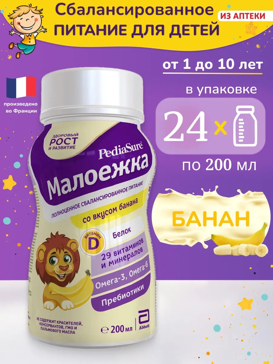 PediaSure Малоежка - вкусный питательный напиток, который обеспечивает полноценное и сбалансированное питание для детей от 1 года до 10 лет. Дополняет несбалансированный рацион необходимыми веществами для здорового роста, развития и укрепления иммунитета.