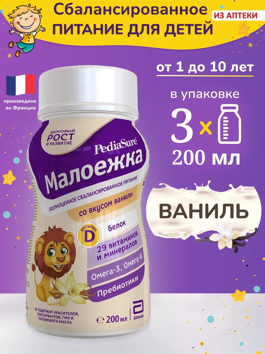 PediaSure Малоежка - вкусный питательный напиток, который обеспечивает полноценное и сбалансированное питание для детей от 1 года до 10 лет. Дополняет несбалансированный рацион необходимыми веществами для здорового роста, развития и укрепления иммунитета.