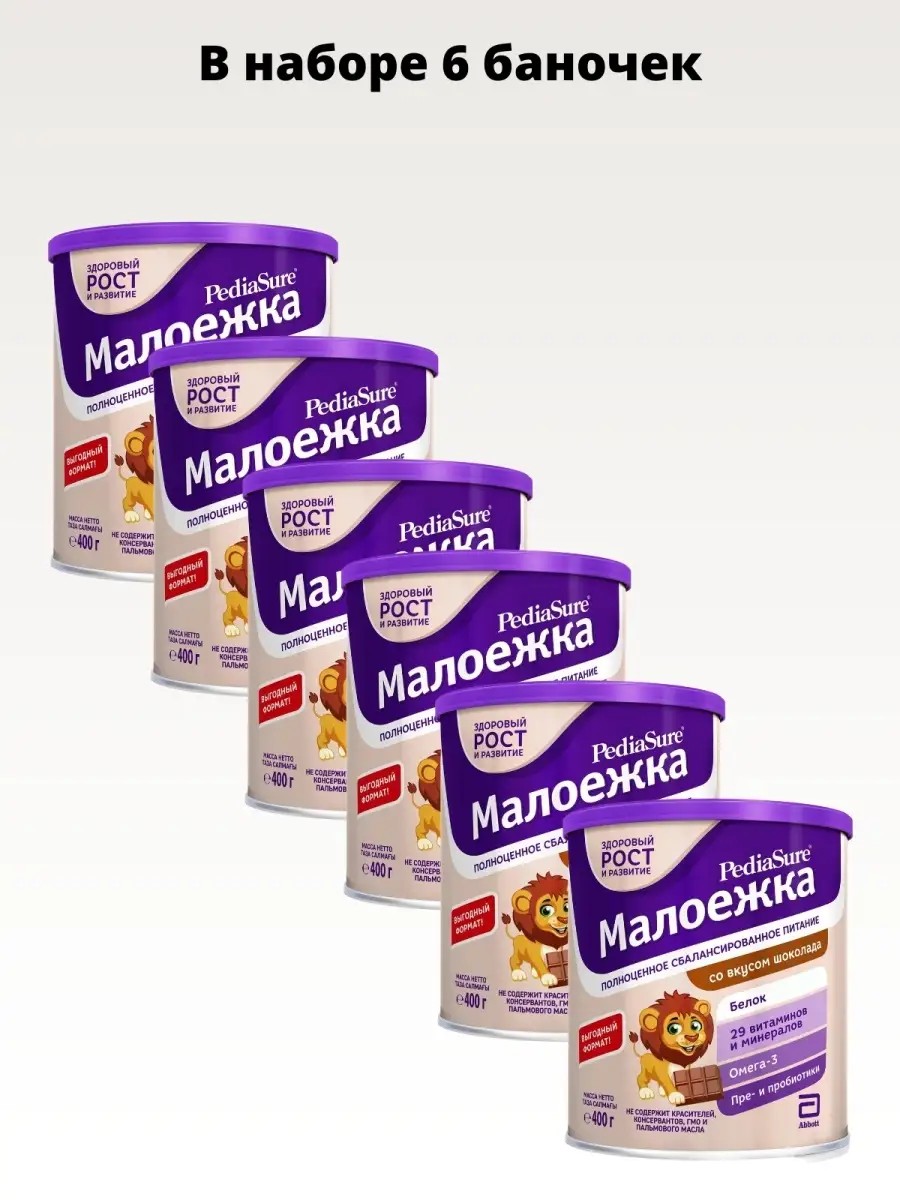 PediaSure Maloezhka (PediaSure), by Abbott - CHOCOLATE - a specialized food product for children's dietary therapeutic nutrition - a dry mixture for enteral nutrition of children aged 1 to 10 years with chocolate flavorPEDIASURE MALOEZHKA is a tasty nutritious drink that supplements an unbalanced meal with nutrients so that the child receives everything necessary for healthy growth and developmentPEDIASURE MALOEZHKA is a complete, balanced diet with proven effectiveness, meeting the needs of children from 1 year to 10 years with a balanced diet. The contents of the package are designed to prepare approximately 8 servings (225 ml each) of the mixture with standard dilution. Preparation of 1 serving 225 ml: Pour 190 ml of water cooled to room temperature into a clean glass or other container. Gradually add 5 measuring spoons of powder and stir until completely dissolved. The drink is ready. Children from 1 to 8 years old - 2 servings per day, 9-10 years - 2-3 servings