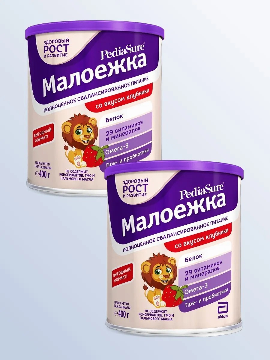 PediaSure Малоежка со вкусом клубники - это вкусный питательный напиток, который дополнит несбалансированную еду питательными веществами, чтобы ребёнок получал всё самое необходимое для здорового роста, развития и укрепления иммунитета. Предназначен для питания детей от 1 года до 10 лет, подходит для ежедневного употребления. В одной банке 400 г содержится 8 порций. В одной порции 225 мл содержится 29 важнейших витаминов и минералов (включая витамины D, A и C), 6. 7 г белка, кальций, йод, железо, Омега-3, 6 жирные кислоты, про- и пребиотики. Сбалансированный помогает ребенку не только расти и развиваться, но и поддерживать иммунную защиту, благодаря содержанию макро- и микронутриентов. PediaSure Малоежка 400 г. Помогает восполнить питательные вещества, которые ребенок не получил вместе с едой. Не содержит искусственных красителей, консервантов, ГМО, пальмового масла и глютена. Имеет клинически доказанную эффективность.
