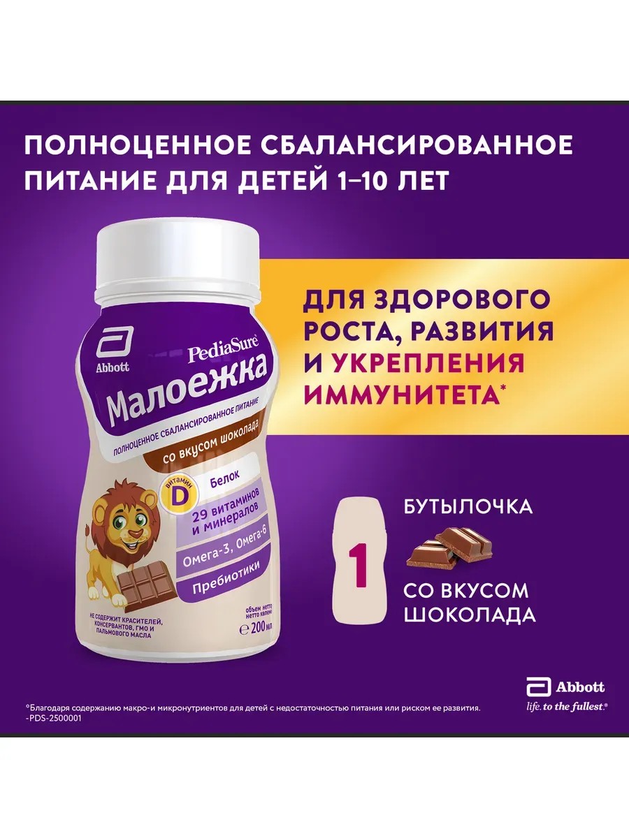 PediaSure Maloezhka infant formula is a delicious, nutritious drink that complements an unbalanced diet with nutrients to ensure your child receives everything they need for healthy growth, development, and a strong immune system. Suitable for children aged 1 to 10 years, it is suitable for daily use. One 200 ml serving contains 29 essential vitamins and minerals (including vitamins D, A, and C), 6 g of protein, calcium, iodine, iron, omega-3 and omega-6 fatty acids, and prebiotics. Its balanced formula not only helps your child grow and develop, but also supports immune defense thanks to its rich macro- and micronutrient content. Pediasure Maloezhka liquid formula is available in 5 different flavors: vanilla, chocolate, strawberry, banana, and natural, which children love. PediaSure Maloezhka in a bottle can be a healthy snack for your child after exercise or a walk, and it's also convenient to take on the go.