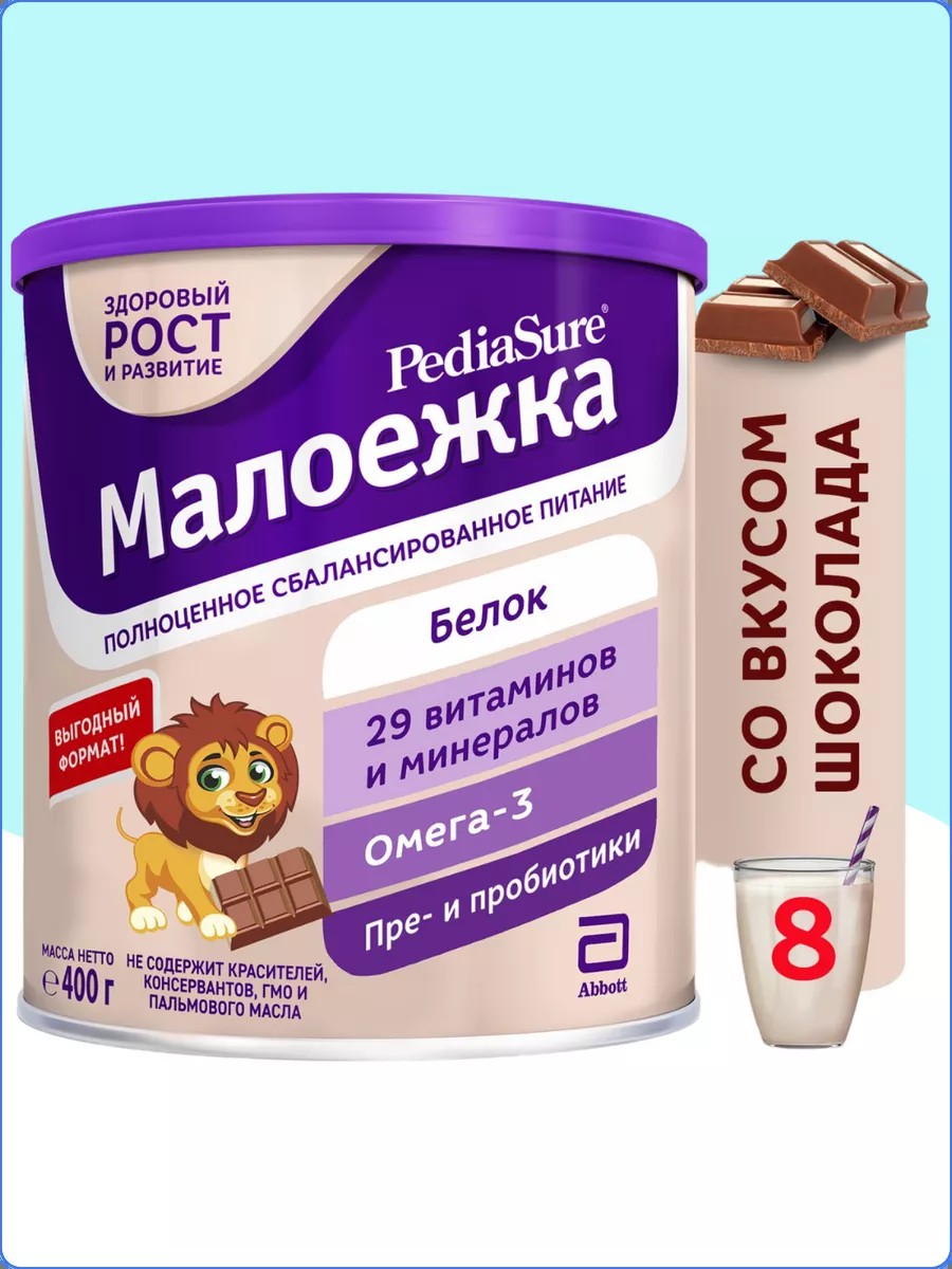 PediaSure Maloezhka chocolate-flavored is a delicious nutritious drink that complements an unbalanced diet with nutrients to ensure your child receives everything they need for healthy growth, development, and a strong immune system. Suitable for children aged 1 to 10 years, this drink is suitable for daily use. One 400g can contains 8 servings.