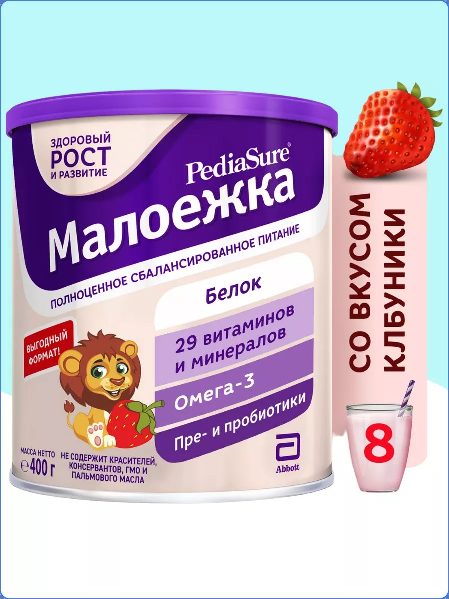 PediaSure Малоежка со вкусом клубники - это вкусный питательный напиток, который дополнит несбалансированную еду питательными веществами, чтобы ребёнок получал всё самое необходимое для здорового роста, развития и укрепления иммунитета. Предназначен для питания детей от 1 года до 10 лет, подходит для ежедневного употребления. В одной банке 400 г содержится 8 порций. В одной порции 225 мл содержится 29 важнейших витаминов и минералов (включая витамины D, A и C), 6.7 г белка, кальций, йод, железо, Омега-3, 6 жирные кислоты, про- и пребиотики. Сбалансированный напиток помогает ребенку не только расти и развиваться, но и поддерживать иммунную защиту, благодаря содержанию макро- и микронутриентов. Помогает восполнить питательные вещества, которые ребенок не получил вместе с едой