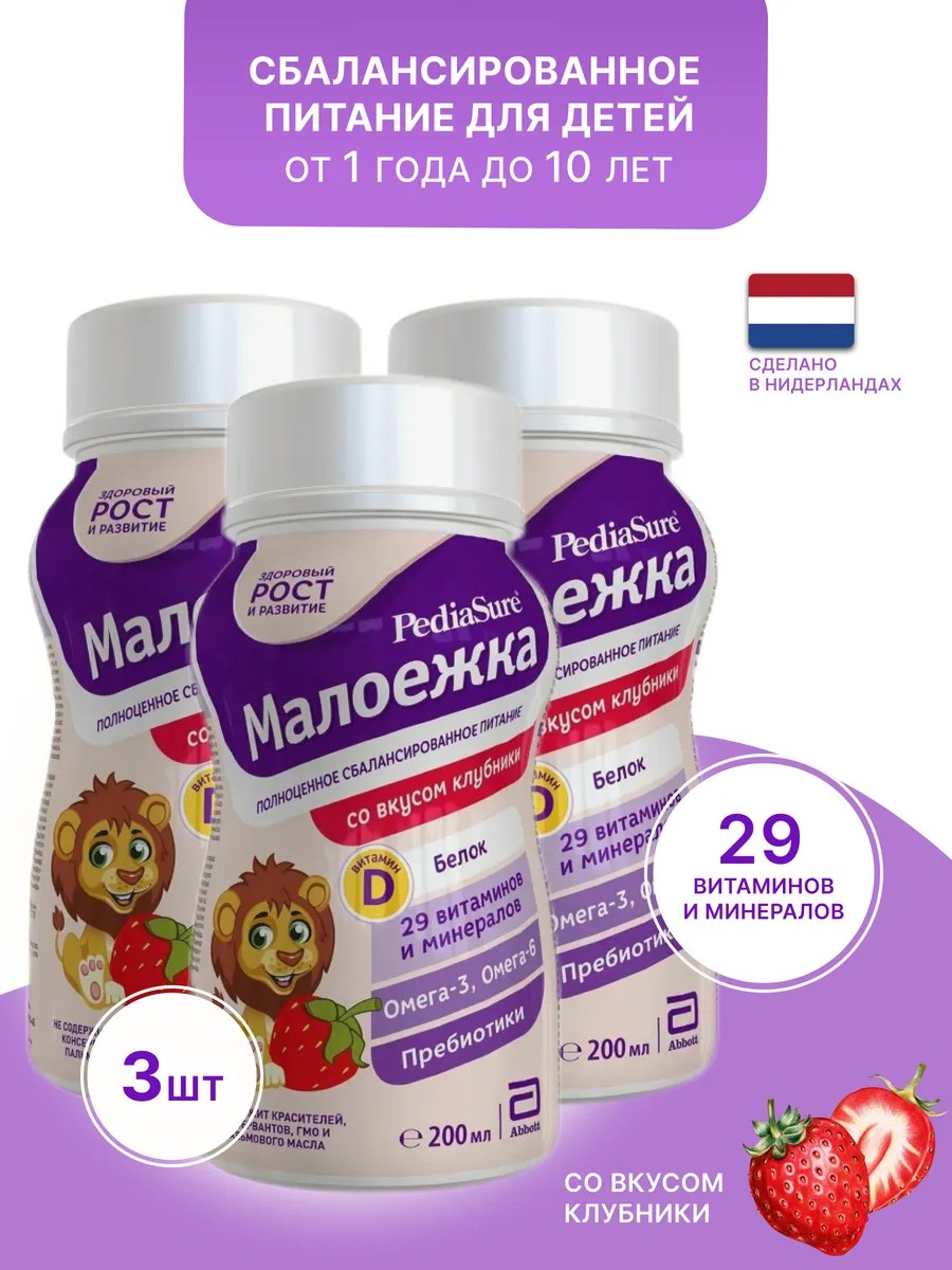 Смесь детская. PediaSure Малоежка - это вкусный питательный напиток, который дополнит несбалансированную еду питательными веществами, чтобы ребёнок получал всё самое необходимое для здорового роста, развития и укрепления иммунитета. Предназначен для питания детей от 1 года до 10 лет, подходит для ежедневного употребления.В одной порции 200 мл содержится 29 важнейших витаминов и минералов (включая витамины D, A и C), 6 г белка, кальций, йод, железо, Омега-3, 6 жирные кислоты, пребиотики. Сбалансированный состав помогает ребенку не только расти и развиваться, но и поддерживать иммунную защиту благодаря содержанию макро- и микронутриентов.Pediasure Малоежка в жидкой форме представлен 5 разными вкусами: ваниль, шоколад, клубника, банан, натуральный, которые так нравятся детям.PediaSure Малоежка в бутылочке может стать здоровым перекусом вашего ребенка после занятий спортом или прогулки, а также его удобно брать с собой в дорогу.