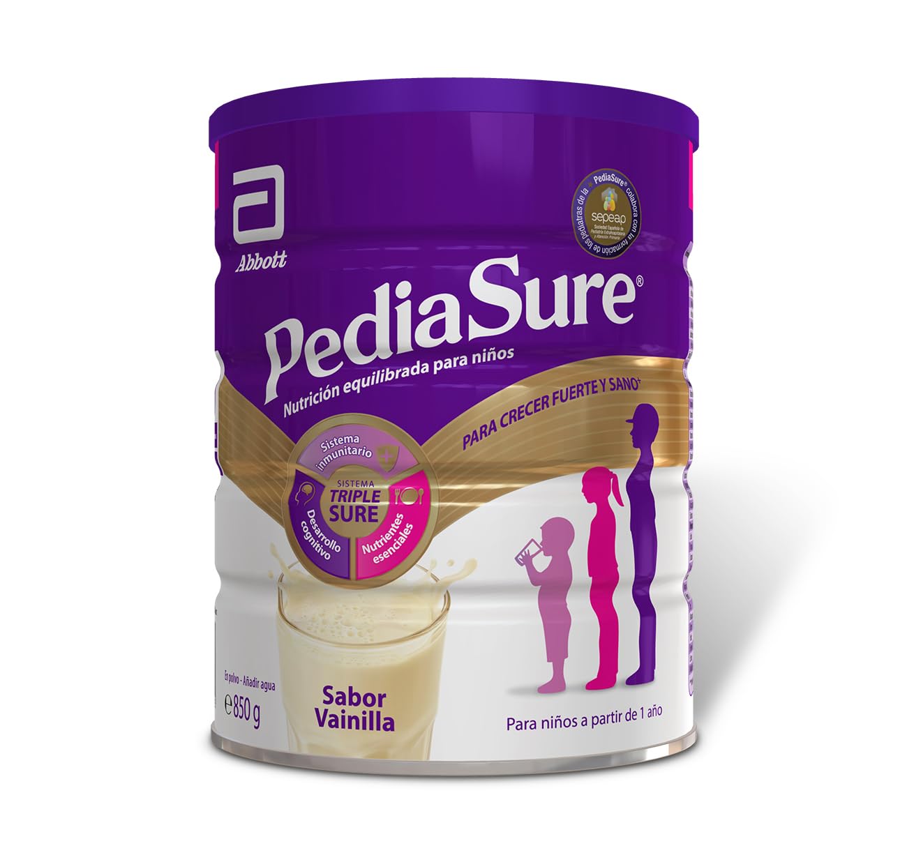 PediaSure is a food supplement specially developed for children aged 1 to 10 years to help them grow up strong and healthy (1). PediaSure contains high-quality protein, 27 vitamins and minerals, including iron. Protein and calcium are necessary for the normal growth and development of bones in children. Vitamin D contributes to the normal function of children's immune system. Iron contributes to children's normal cognitive development. And children love the taste (2). (1) Essential fatty acids are necessary for the normal growth and development of children. This beneficial effect is obtained with a daily intake of 2 g of alpha-linolenic acid (ALA) and 10 g of linoleic acid (LA). (2) Based on a Walnut study conducted in July 2018 involving a taste test with 100 Spanish children aged 4 to 7 years, of whom more than 90 liked the taste of PediaSure (vanilla, chocolate, or strawberry powder). It is very important to maintain a varied and balanced diet and a healthy lifestyle. PediaSure is a food supplement and not a substitute for food. Vanilla images are for illustrative purposes only. PediaSure does not contain vanilla. Not suitable for children with galactosemia. Packaged in a protective atmosphere. Recommended intake: Take with or between meals, as needed. Do not exceed the maximum number of servings per day: 1 serving for children aged 1 to 3 years 2 servings for children over 4 years. Food supplements should not be used as a substitute for a varied and balanced diet and a healthy lifestyle. Storage instructions: Store the box in a cool, dry place (not refrigerated) at room temperature. Once opened, the box should be covered and its contents used within 4 weeks. Once the mixture is finished, PediaSure should be covered, refrigerated, and used within 24 hours. Keep out of reach of children. Warning: Never heat the formula in a microwave oven. Severe burns may occur. Excessive consumption may cause intestinal upset. Avoid consuming with medications and other fiber supplements. Made in the European Union. Distr. ES - Abbott Laboratories, S.A. Avenida de Burgos, 91 - 28050 Madrid. Exclusively for sale in Spain. INGREDIENTS Hydrolyzed corn starch, sucrose, vegetable oils (canola, high oleic sunflower, sunflower, palm kernel oil MCT), milk protein concentrate, maltodextrin, soy protein isolate, oligofructose (FOS ), minerals (potassium citrate, sodium citrate, tribasic calcium phosphate, potassium chloride, magnesium chloride, monobasic potassium phosphate, calcium carbonate, dibasic potassium phosphate, sodium chloride, dibasic magnesium phosphate, ferrous sulfate, zinc sulfate, manganese sulfate, cupric sulfate, potassium iodide, chromium chloride, sodium selenite, sodium molybdate), flavoring (sodium protein). MILK), emulsion. Suitable for: soy lecithin, DHA microalgae oil Schizochytrium sp. (Milk protein), choline chloride, vitamins (C, E, niacinamide, calcium pantothenate, B1, B6, B2, vitamin A palmitate, folic acid, K1, biotin, D3, B12), antioxidants (E304, E306), taurine, myoinositol, carnitine tartrate, lactobacillus S acidophilus. Fructo-oligosaccharides. Docosahexaenoic acid. DIRECTIONS FOR USE To prepare a 225 ml serving, pour 190 ml of water into a glass. Gradually add 5 level, packed scoops (measuring stick included in the box) of PediaSure. Stir until dissolved. One 400 g can provides approximately 8 servings of 225 ml. Do not boil the formula. If you wish to consume PediaSure soaked, it is recommended to warm the liquid in a water bath and keep it below 35 C to avoid affecting the stability of the lactobacillus. Store the container in a cool, dry place (not refrigerated) at room temperature. Once opened, the container should be covered and its contents used within 4 weeks. Once the mixture is complete, PediaSure should be covered, refrigerated, and used within 24 hours. Keep out of reach of children. SAFETY WARNING To prepare a 225 ml serving, pour 190 ml of water into a glass. Gradually add 5 level, packed scoops (using the scoop included in the container) of PediaSure . Stir until dissolved. One 400 g can provides approximately 8 x 225 ml servings. Do not bring the formula to a boil. If you wish to consume PediaSure soaked, it is recommended to warm the liquid in a water bath and keep it below 35 C to avoid affecting the stability of the lactobacillus. Store the container in a cool, dry place (not refrigerated) at room temperature. Once opened, the container should be covered and its contents used within 4 weeks. Once the mixture is complete, PediaSure should be covered, refrigerated, and used within 24 hours. Keep out of reach of children. See morePediaSure – Goût vanille – Complément alimentaire pour enfants avec protéines, vitamines et minéraux – 850 gr Vanille 850 g (Paquete de 1)DESCRIPTION DU PRODUIT DESCRIPTION DU PRODUIT PediaSure est un complément alimentaire spécialement développé pour les enfants de 1 à 10 ans qui les aide à grandir forts et en bonne santé (1). PediaSure contient des protéines de haute qualité, 27 vitamines et minéraux, dont le fer. Les protéines et le calcium sont nécessaires à la croissance et au développement normaux des os chez les enfants. La vitamine D contribue au bon fonctionnement du système immunitaire des enfants. Le fer contribue au développement cognitif normal des enfants. Et les enfants adorent son goût (2). (1) Les acides gras essentiels sont nécessaires à la croissance et au développement normaux des enfants. Cet effet bénéfique est obtenu avec un apport quotidien de 2 g d'acide a-linolénique (ALA) et 10 g d'acide linoléique (LA). (2) Basé sur une étude menée par Walnut en juillet 2018 consistant à déguster des saveurs chez 100 enfants espagnols âgés de 4 à 7 ans, dont plus de 90 ont aimé le goût de PediaSure (format poudre saveur vanille, chocolat ou fraise). Il est très important de maintenir une alimentation variée et équilibrée accompagnée d'un mode de vie sain. PediaSure est un c