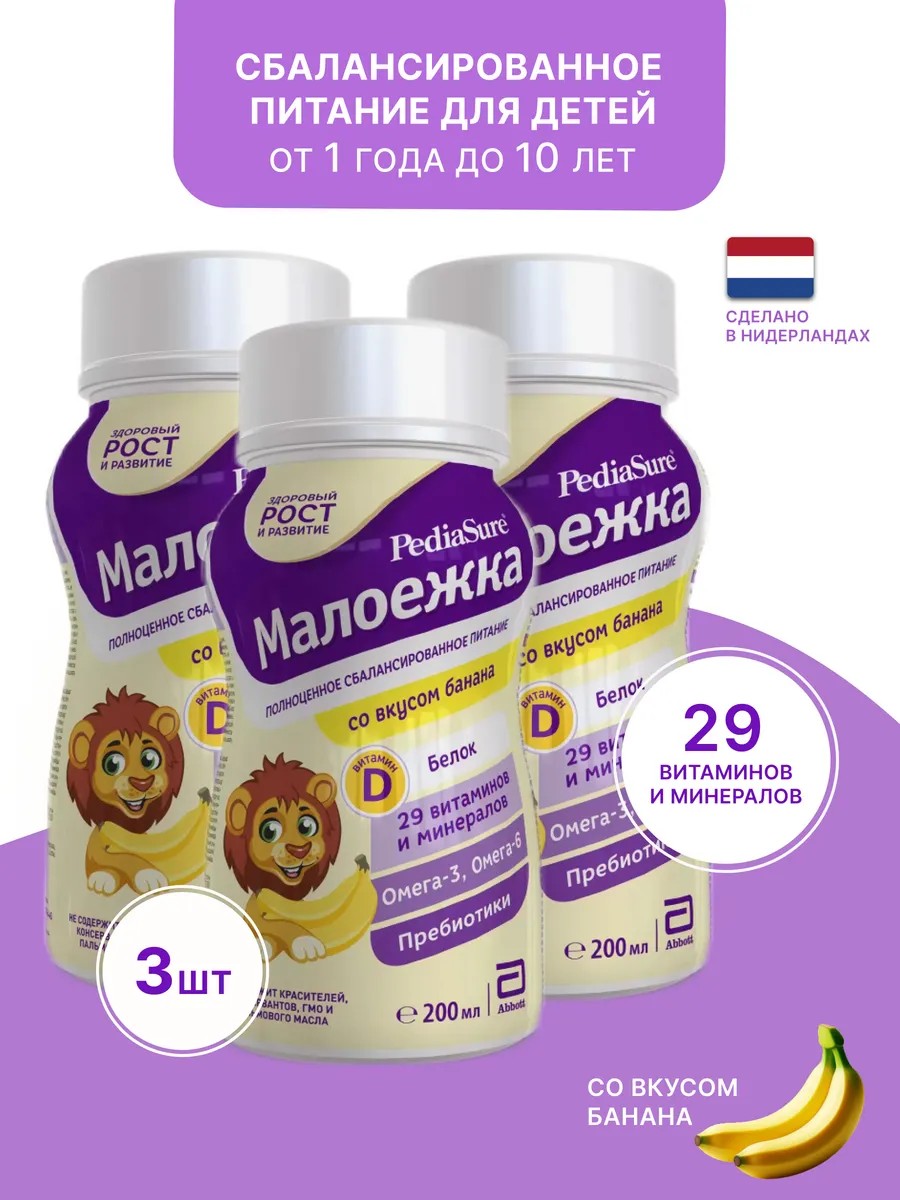 PediaSure Maloezhka infant formula is a delicious, nutritious drink that complements an unbalanced diet with nutrients to ensure your child receives everything they need for healthy growth, development, and a strong immune system. Suitable for children aged 1 to 10 years, it is suitable for daily use. One 200 ml serving contains 29 essential vitamins and minerals (including vitamins D, A, and C), 6 g of protein, calcium, iodine, iron, omega-3 and omega-6 fatty acids, and prebiotics. Its balanced formula not only helps your child grow and develop, but also supports immune defense thanks to its rich macro- and micronutrient content. Pediasure Maloezhka liquid formula is available in 5 different flavors: vanilla, chocolate, strawberry, banana, and natural, which children love. PediaSure Maloezhka in a bottle can be a healthy snack for your child after exercise or a walk, and it's also convenient to take on the go.