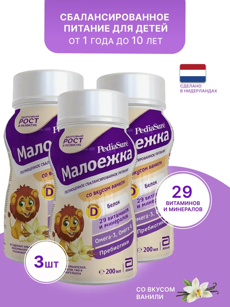 PediaSure Maloezhka infant formula is a delicious, nutritious drink that complements an unbalanced diet with nutrients to ensure your child receives everything they need for healthy growth, development, and a strong immune system. Suitable for children aged 1 to 10 years, it is suitable for daily use. One 200 ml serving contains 29 essential vitamins and minerals (including vitamins D, A, and C), 6 g of protein, calcium, iodine, iron, omega-3 and omega-6 fatty acids, and prebiotics. Its balanced formula not only helps your child grow and develop, but also supports immune defense thanks to its rich macro- and micronutrient content. Pediasure Maloezhka liquid formula is available in 5 different flavors: vanilla, chocolate, strawberry, banana, and natural, which children love. PediaSure Maloezhka in a bottle can be a healthy snack for your child after exercise or a walk, and it's also convenient to take on the go.