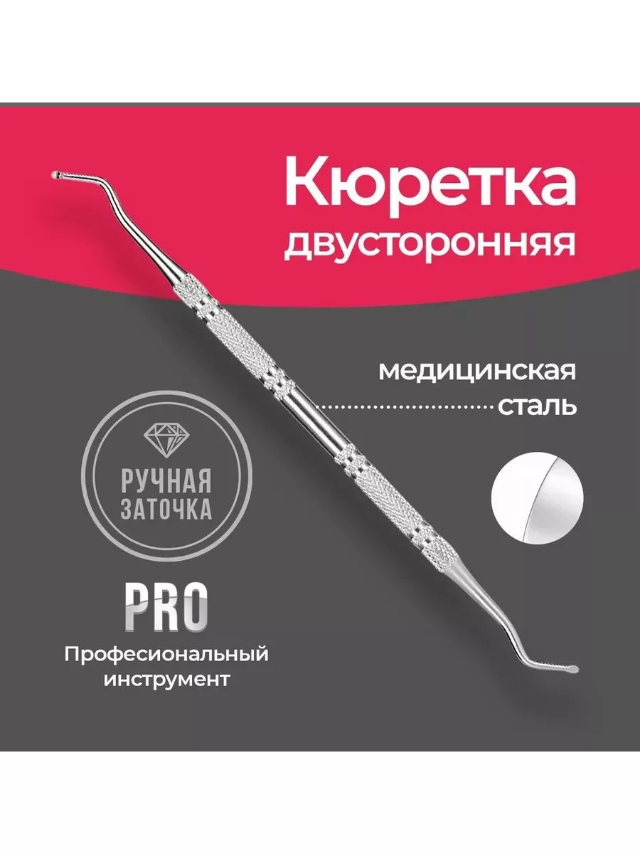 Кюретка двусторонняя для педикюра и маникюра от вросших ногтей и для удаления кутикулы. Инструмент выполнен из профессиональной нержавеющей медицинской стали ручной заточки поможет убрать кутикулу. Шабер для педикюра и маникюра используется для коррекции вросших ногтей, подногтевых мозолей и подрезания кутикулы. Медицинский инструмент применяется для механического удаления грязи из под ногтей, остатков огрубевших, ороговевших и омертвевших частиц кожи в области ногтевых валиков и под ногтями. Длина предмета 13,5 см. Пушер для маникюра имеет два удобных изогнутых наконечника, направленных в разные стороны. Кончик нужно аккуратно заводить под вросший в палец ноготь, вычищая грязь из-под свободного края. Кюретка подготавливает ногти к дальнейшим этапам их обработки. С помощью профессионального инструмента легко извлекается край ногтевой пластины из кожи без микротравм и разрезов. Рельефная эргономичная ручка улучшает фиксацию в руках мастера, предотвращает скольжение в руке. Материал 100% сталь устойчива к износу и всем видам стерилизации, не подвержена коррозии и не ржавеет. Кюретку можно повторно затачивать. Для повторного использования стальной профессиональный инструмент подвергают процедуре дезинфекции или стерилизации. Перед применением ногти тоже необходимо обрабатывать антисептиком. Для обработки лопатки для маникюра используется дезинфицирующее средство для маникюрных инструментов, сухожар, УФ бокс.