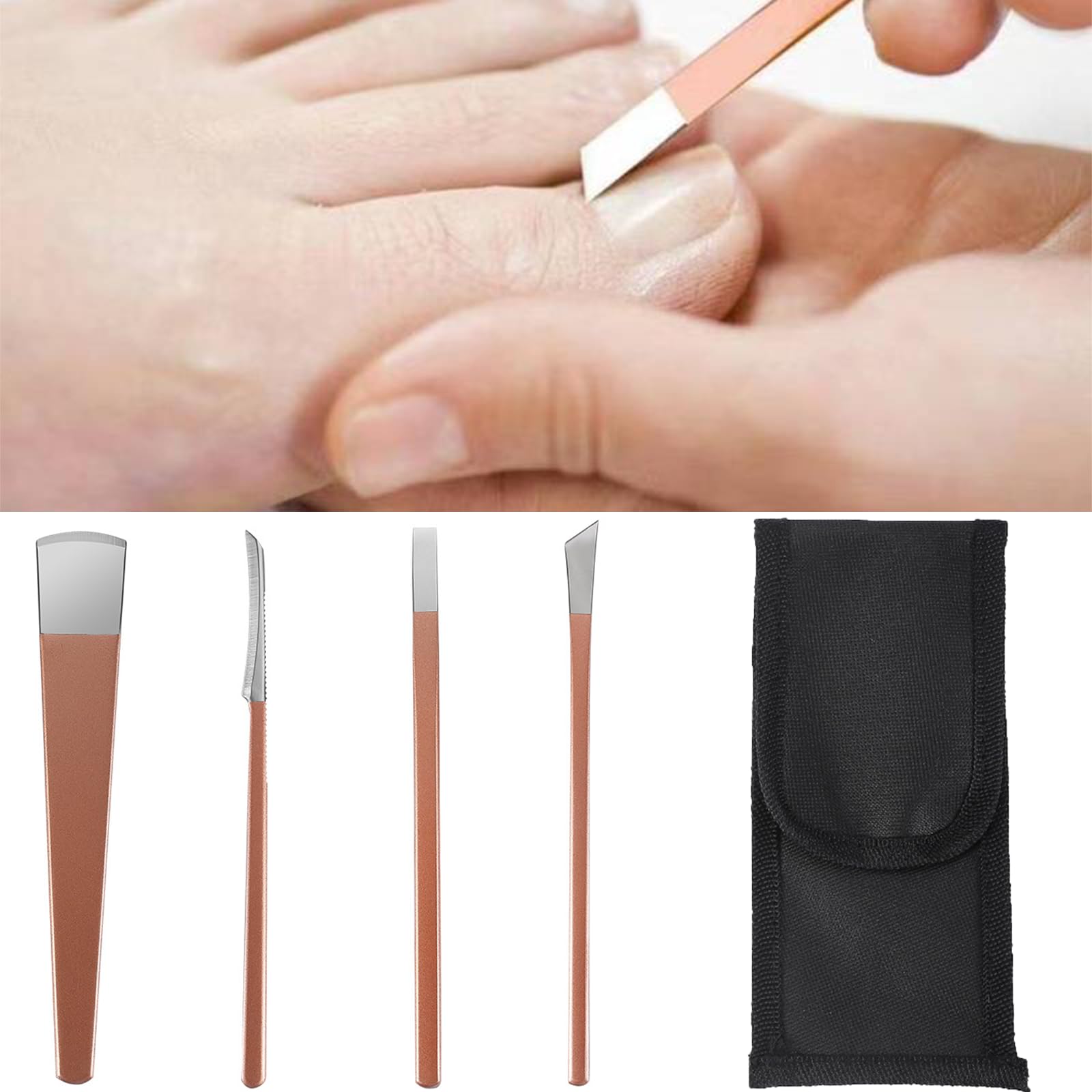 description 1Professional pedicure set can effectively remove dead skin, calluses and cuticles. Balance tools can remove calluses, warts and corns, and can also trim toenails. When dealing with ingrown nails, the oblique cutting tool can remove the residual nails at the root of toenails. Foot scraping tools can remove dead skin and dirt between feet and toes, and can also be used to relieve foot itching. Slicing will trim calluses, corns, plantar warts, etc. For clean and healthy feet. 2We suggest soaking your feet for 10 minutes to soften the cuticle of your feet, and then use our repair kit to make your feet smoother. 3 professional stainless steel pedicure tool set with flexible and lightweight design can solve the problem of dry feet for you. If you have these tools, there is no need to go out for foot treatment. specifications product name: pedicure set of 4. the package includes: 1 cutting tool, 1 flat-headed tool, 1 taper tool, 1 scraper tool and 1 storage bag. color: rose gold size: as shown in the figure. matters need attention 1Due to manual measurement, please allow an error of 1-3mm. Thank you for your understanding. 2Due to the different calibration of the monitor, the color of the items displayed in the photo may be slightly different from the real thing. Please take the facts as the standard. 3Please keep this product out of the reach of children to avoid unnecessary accidents.Easy to storepedicure set of 4 is small, light and easy to operate, suitable for all kinds of people, and can be used for indoor and outdoor pedicures with a black pocket, which is more convenient to store. [Usage] Before using the tool, it is recommended to soak the feet in warm water for 10 minutes, which can soften the dead skin on the soles of the feet, so that it is easier to remove the dead skin on the soles of the feet, paronychia and other problems. [Selection] We have selected four hard leather foot stalls, and each foot stall fits your needs more accurately. Perfect design no longer has to worry about rough skin, making your feet smoother from now on. [Meet different requirements] You will get four different types of pedicure tools, which can meet your different requirements. Cutting tools will cut corns, corneas, plantar warts and so on. Keep your feet clean and healthy. MaterialFoot Pedicure set is made of high quality stainless steel, which is guaranteed in quality, not easy to corrode, and can safely and painlessly remove dead skin from feet, so you don't have to worry about foot injury or bleeding.